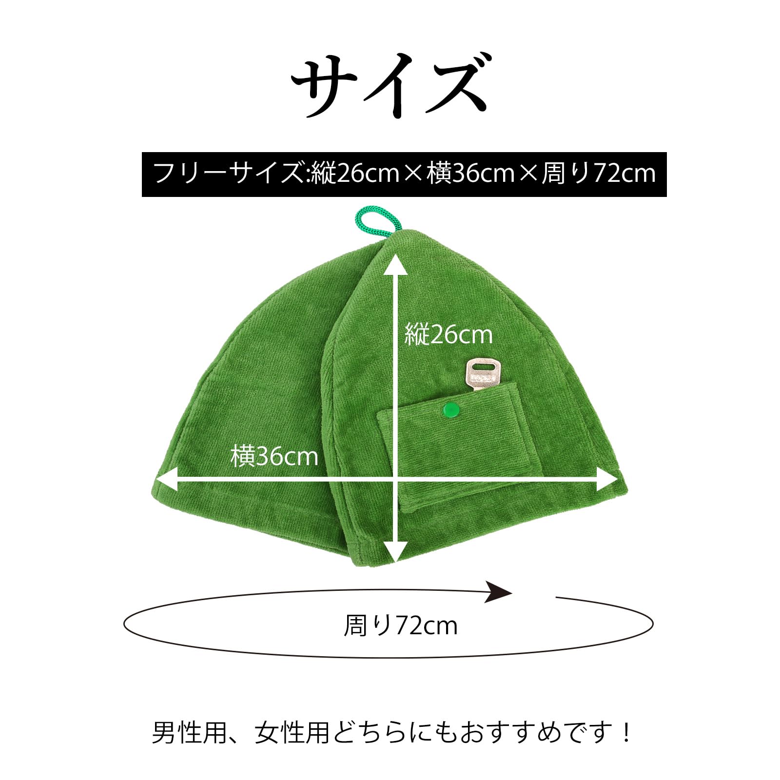 【サウナハット製品仕様】サイズ:縦26cm*横36cm*周り72cmで、大人の頭にピッタリです。 頭の保護だけでなく視界の遮断も出来て余計な物を見る事も無く、集中してサウナに入っていられます。