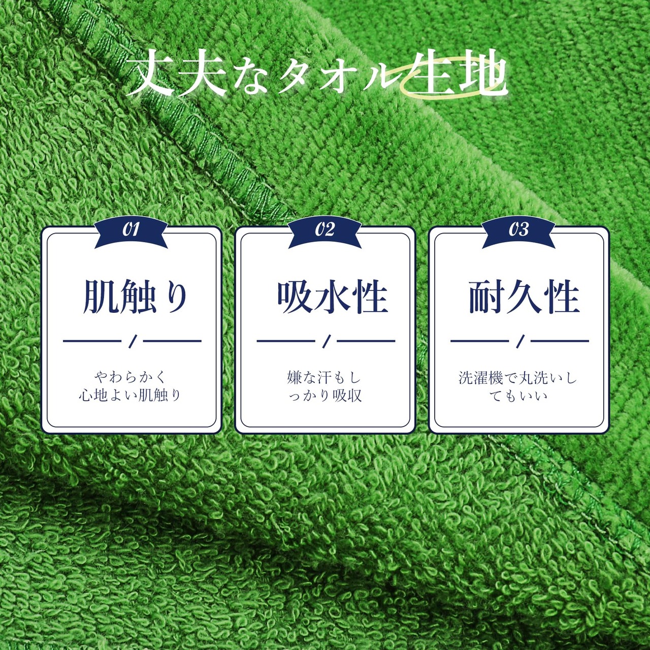 【丈夫なタオル生地】丈夫なタオル生地で、肌触りが良くて使い心地がよいです。吸水性も抜群で、嫌い汗もしっかり吸収できます。
