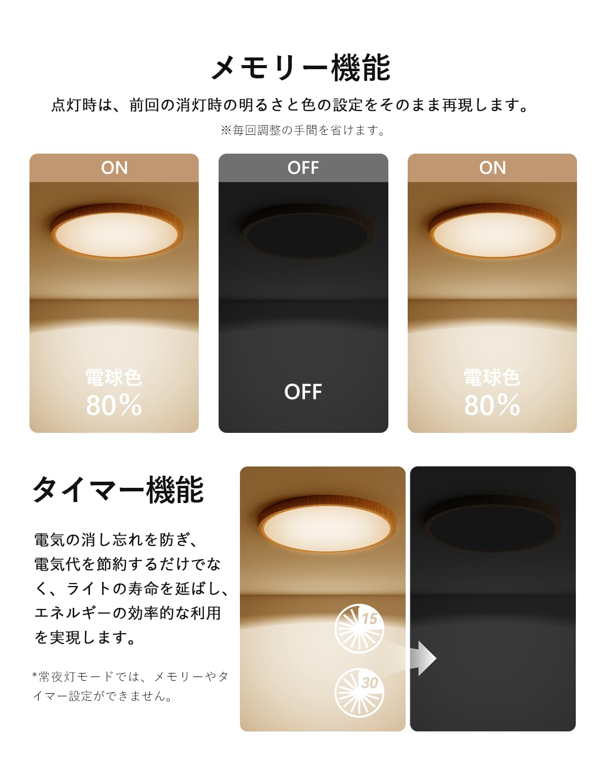 【記憶機能 & 定刻消灯】①進化した記憶機能:他社の照明製品は長夜灯を使用すると以前の照明設定がリセットされることが多いですが、本製品は長夜灯を使用した後でも次回点灯時に前回の設定を正確に再現できるため、毎日の設定を省くことができます。②自動消灯機能:15分または30分設定後、灯光が自動的に消灯し、忘れてしまってずっと点灯している心配を解消します。