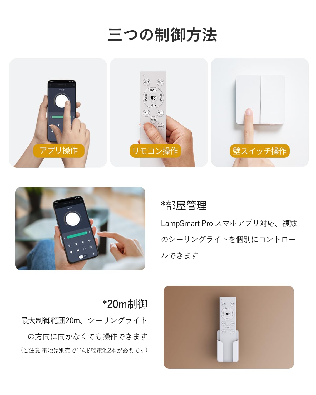 【リモコン & スマホ操作】①リモコンのペアリング:壁スイッチをオフ→オン後2秒以内に「点灯」ボタンを3~5秒長押し。点滅したら完了。※ブレーカーでもOK。②2.4Gリモコン:最大20m範囲で操作可能。ホールダー付きで紛失防止。電池(別売)要。③スマホ操作:LampSmart Proアプリでも簡単操作。リモコン無くても安心!