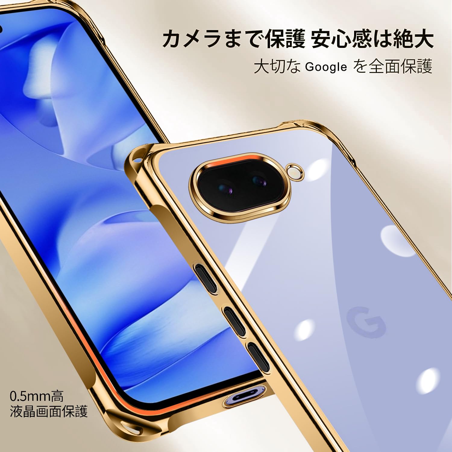 【こだわりの設計・レンズと液晶を保護】面と背面カメラ部のフチを高く設計し、液晶画面とカメラレンズをキズから保護します。 スマホを机などの平面に置いた場合に、液晶画面とカメラレンズが接触してできるキズが最小限に抑えられるよう、表側(液晶画面側)は1.0mmの、裏側(背面側)は0.5mmの高低差をつけ、ちゃんと携帯を保護することができます。