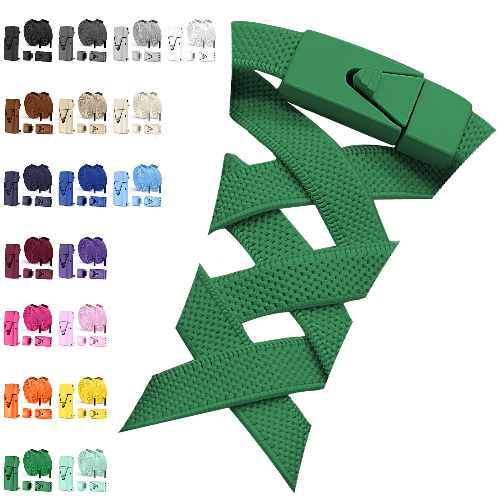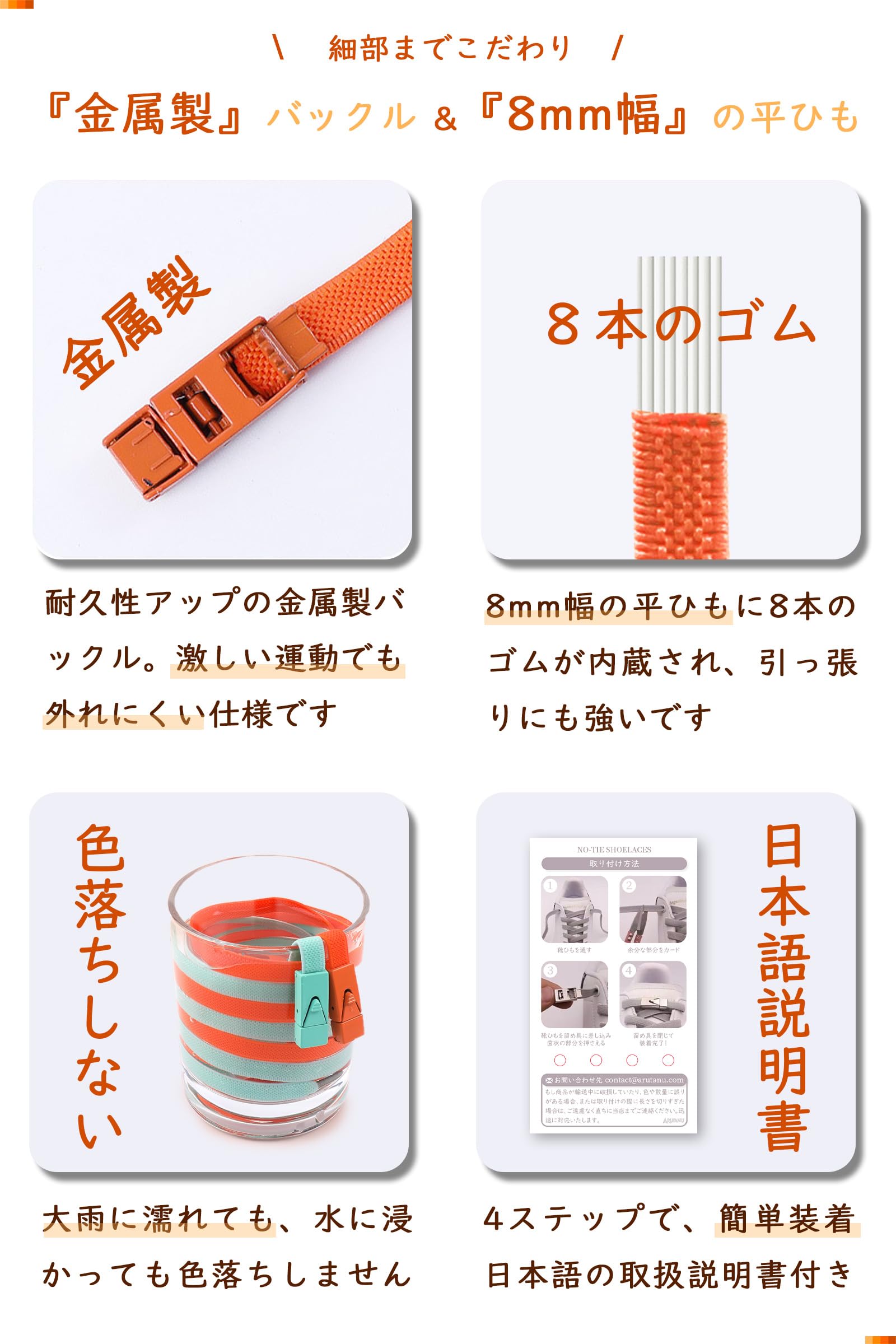この結ばない靴ひもは、結ぶ必要がなく、伸縮性のあるゴム素材で簡単に脱ぎ履きが可能です。雨の日や急いでいる時でも、靴ひもがほどける心配がありません。2024年新登場の押しボタン式バックルを採用し、従来品のネジ式留め具に比べて取り付けが簡単です。4ステップで装着が完了し、靴ひものねじれを防ぎ、美しい見た目を保ちます。8mm幅の平ひもには8本のゴムが内蔵されており、耐久性が高く引っ張りにも強い仕様です。金属製のバックルを使用しているため、激しい運動でも外れにくく、安心です。また、靴ひもの長さは約100cmで、穴が14個以下の靴に対応可能。弾力性があるため、必要に応じて長さを調整でき、短い靴ひもや子供用の靴にも対応します。スニーカー、ブーツ、ドレスシューズなどあらゆる種類の靴に対応可能な全18色のバリエーションから選べ、バックルと靴ひもが同色で、カラフルなひもを靴のアクセントカラーとして使うことで、オリジナルのコーディネートを楽しむことができます。