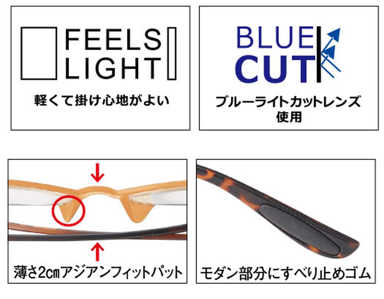 【特徴】パソコン・スマホから発光される目に有害なブルーライトをしっかりカット。 日本人専用設計で薄さ2mmアジアンフィットパット採用。つけ心地よく、ズレ落ちにくい鼻パット。ツルの先端(モダン)部分に滑り止めゴム付きでWフィット構造。