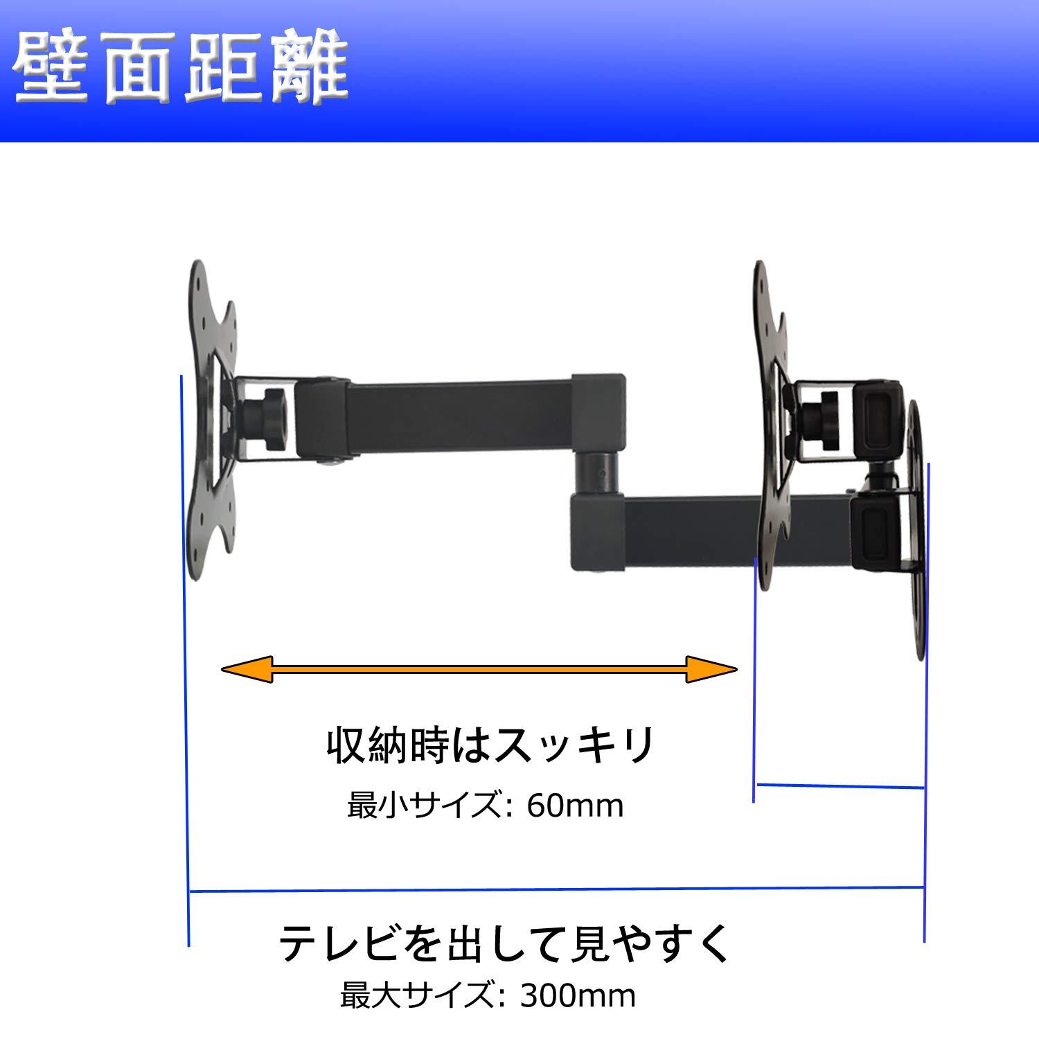 【壁掛け テレビモニター~角度調節】アームタイプの壁掛け金具で、左右・上下・前後の見やすい向きにテレビを調整可能です。角度は左右に各90°、上下に下向き15°、前後に60~300mm調節可能です。自分の見やすい角度に調節できて快適です。