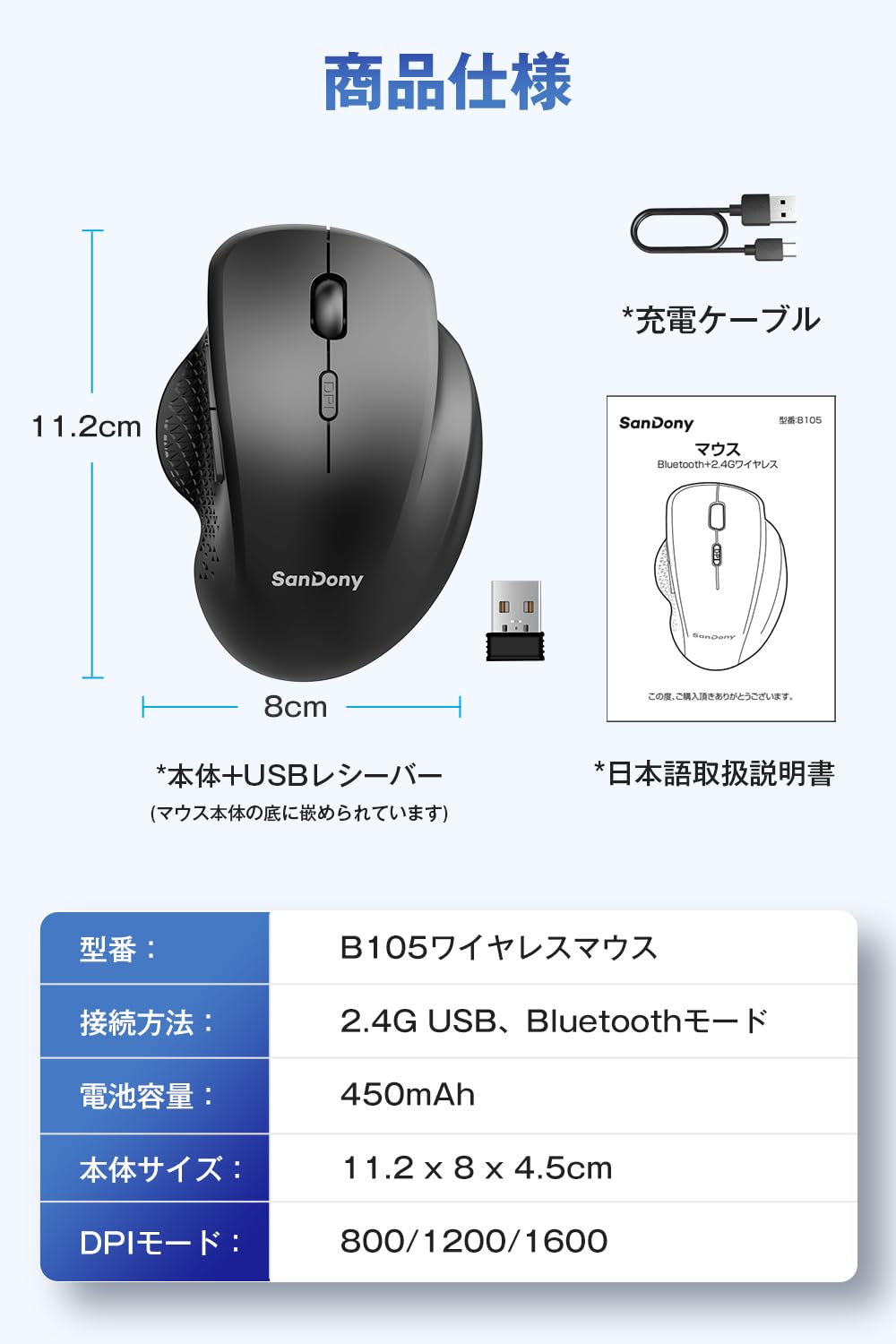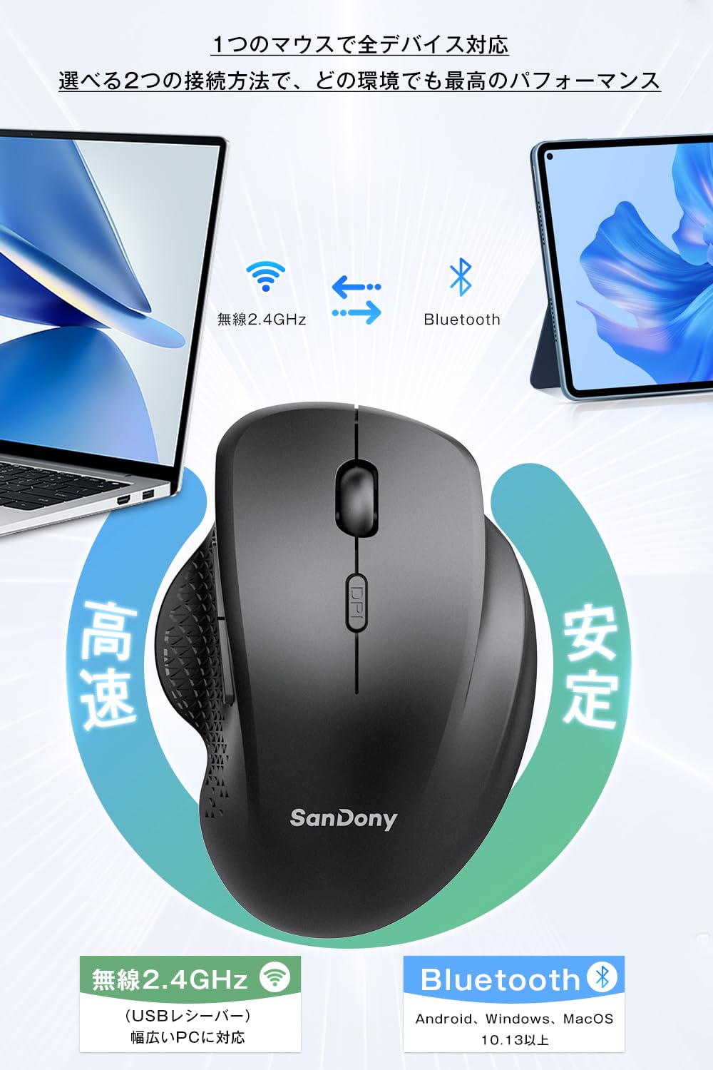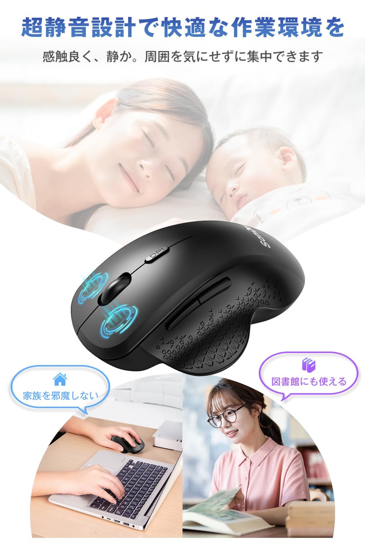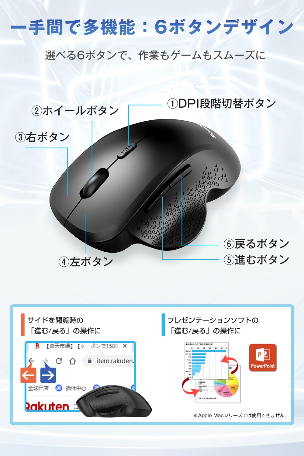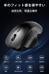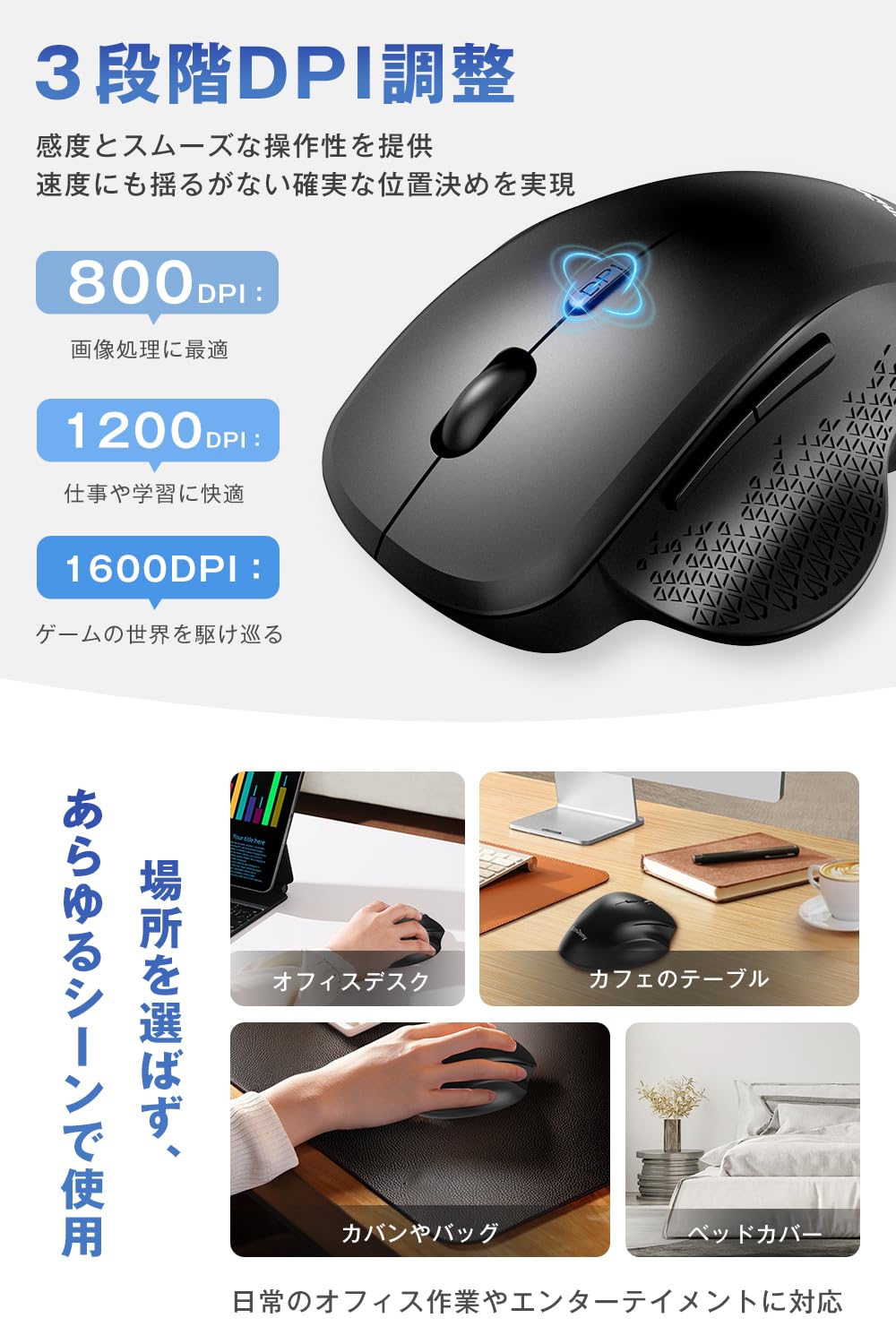 マウス Bluetooth 静音 【マルチ接続・2.4GHz&BLuetooth5.2】 ワイヤレスマウス マウス 無線 5ボタン 握りの極み エルゴノミクス マウス 節電モデル 【戻る/進むボタン搭載】 DPI3段階切替 USB 充電式 Windows mac Chrome pc wireless mouse (ブラック)