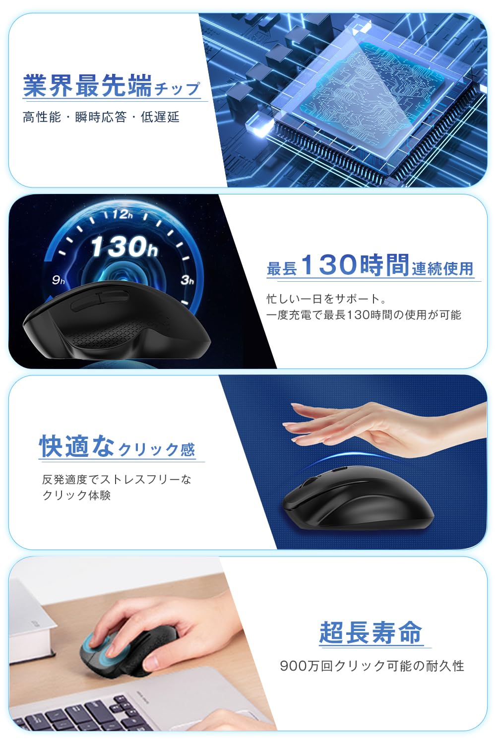 【手に優しい・人間工学デザイン】長時間の使用でも疲れを感じさせない、このエルゴノミクスマウス。手に自然にフィットする形状と心地よい手触りは、快適な使用体験を提供します。ブルートゥース マウスが人間工学に基づき、手の疲労を最小限に抑え、長時間の仕事やゲームも快適に楽しめます。