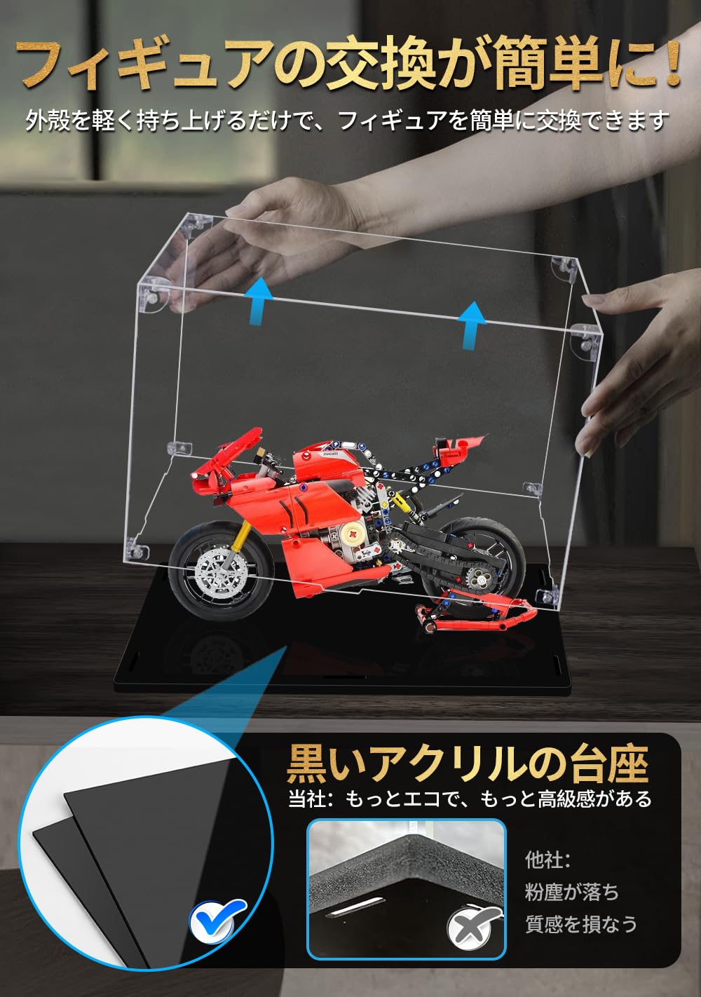 【組立簡単】ワンクリックで簡単に組み立てができ、積み木を組み立てるように簡単、工具や接着剤は必要ない。フィギュアケースの台座にはキャラクターの交換を容易にする柔軟なソケットを設計されています。フィギュアボックスを軽く持ち上げるだけで、簡単に展示品を入れたり取り出したりすることができ、古いタイプの分解しなければ展示品を交換できないという欠点が改善されました。