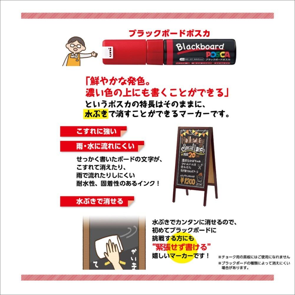 「ブラックボードポスカ」は従来より発売しております『ポスカ』のインク改良を行い、水ぶきで消せる性能を持たせました。