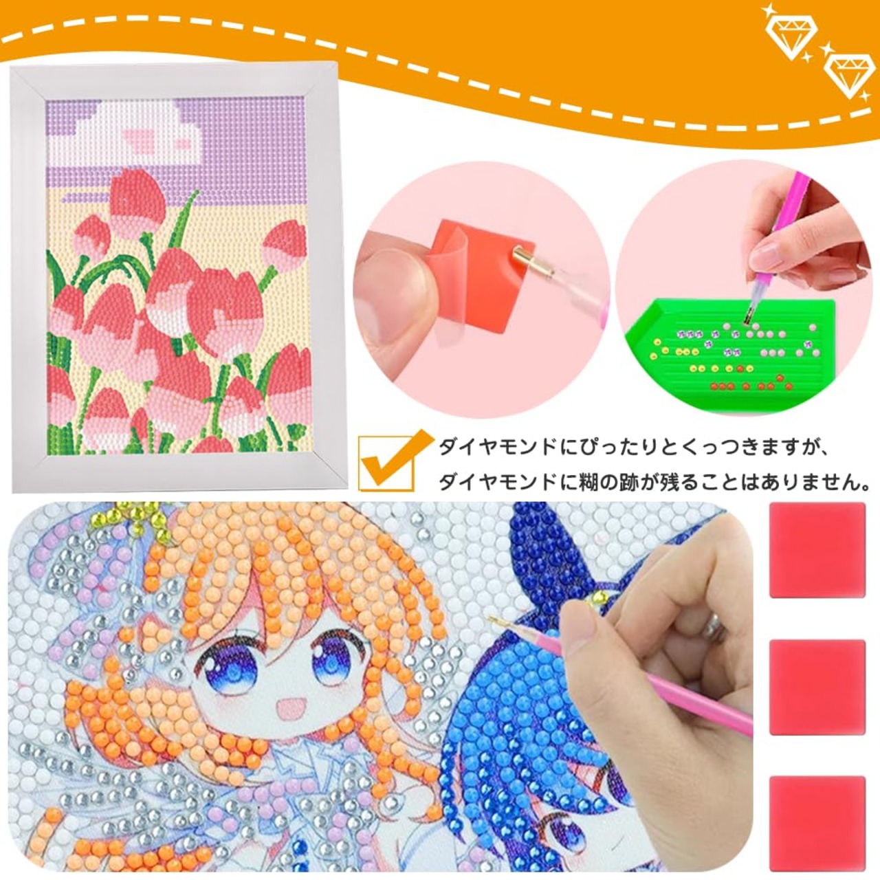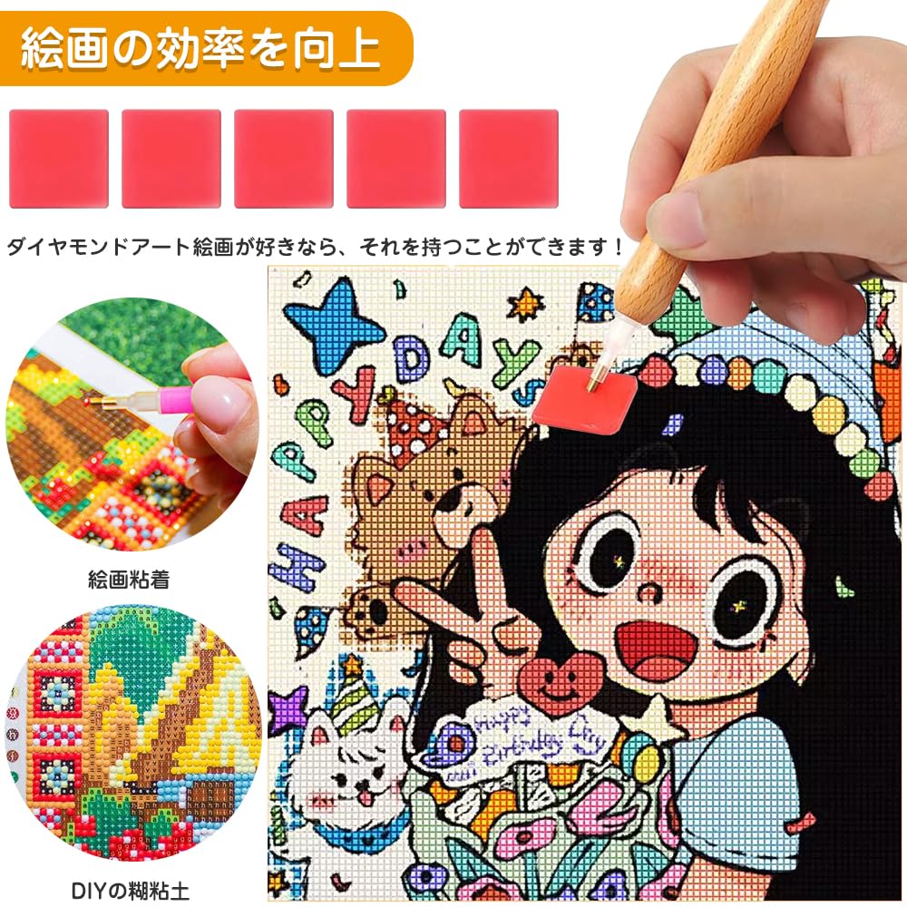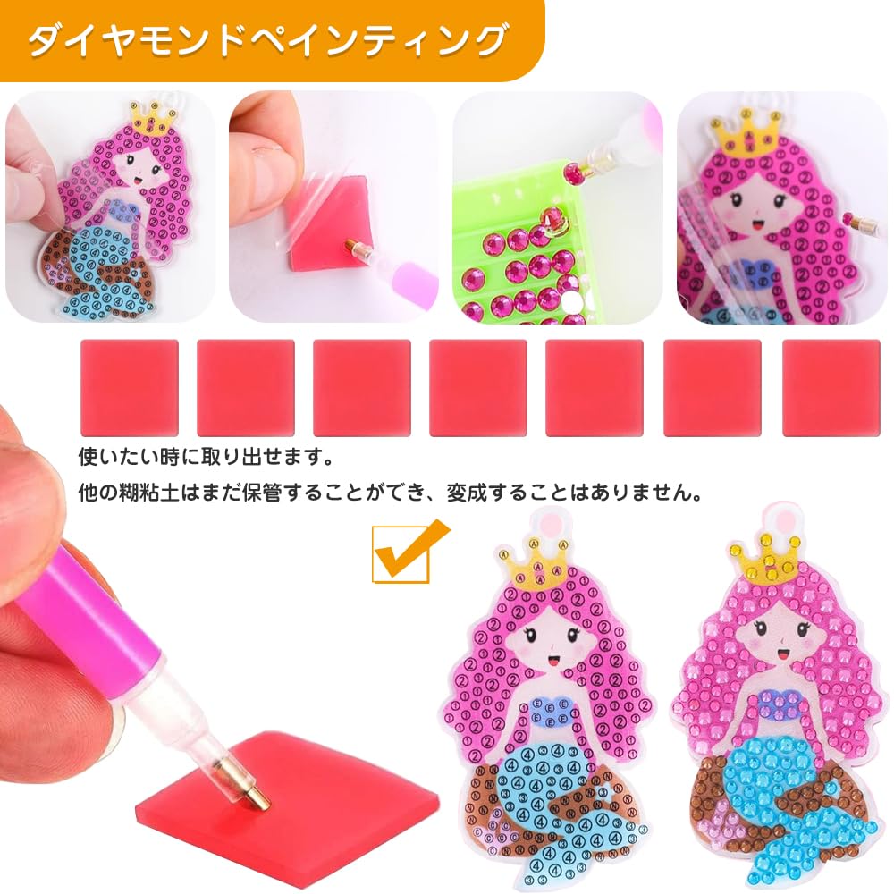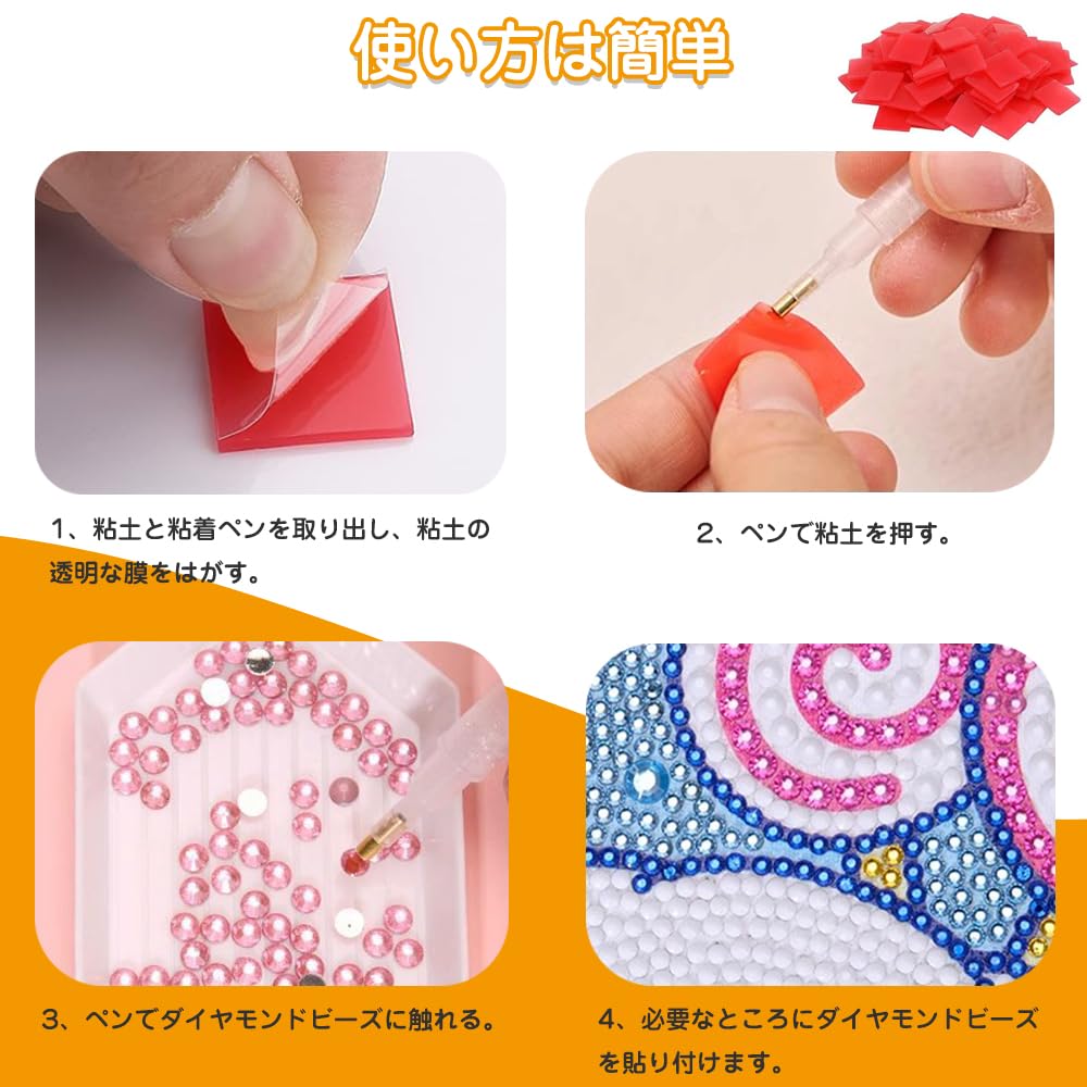 使い方は簡単です:まず他のステップを準備してから、粘土から透明な保護フィルムを剥がして、絵の粘土に絵の糊棒を押し付けて、ダイヤモンドビーズをダイヤモンドの絵に貼り付けます。シンプルで使いやすいです。