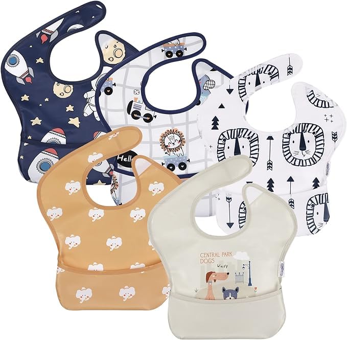 [GLLQUEN BABY] 食事エプロン 5点セット ベビー 子供 汚れ防止 フリーサイズ 防水 洗濯機可能 調節可能 BPAとフタル酸塩なし 旅行に最適