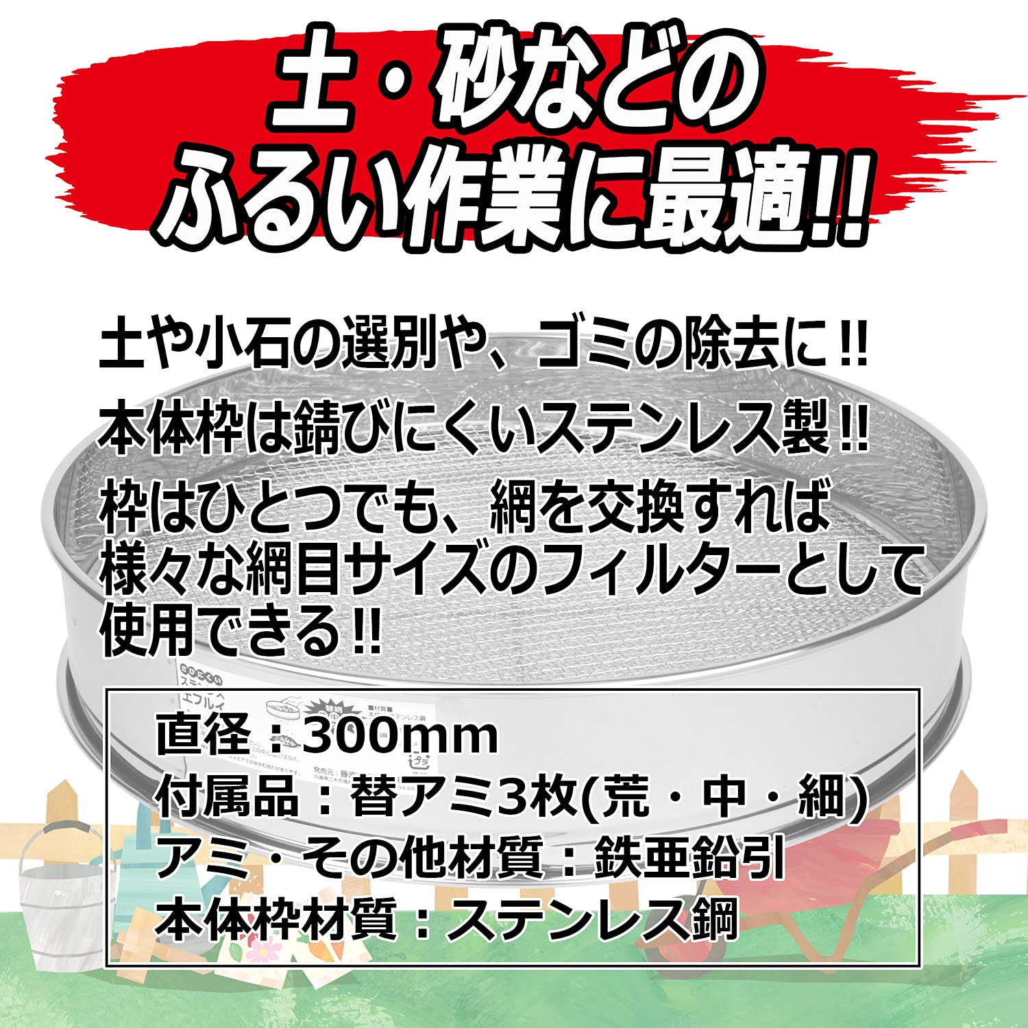 【人気商品】千吉 ステンレス土フルイ 30cm 替え網3枚付(荒・中・細)