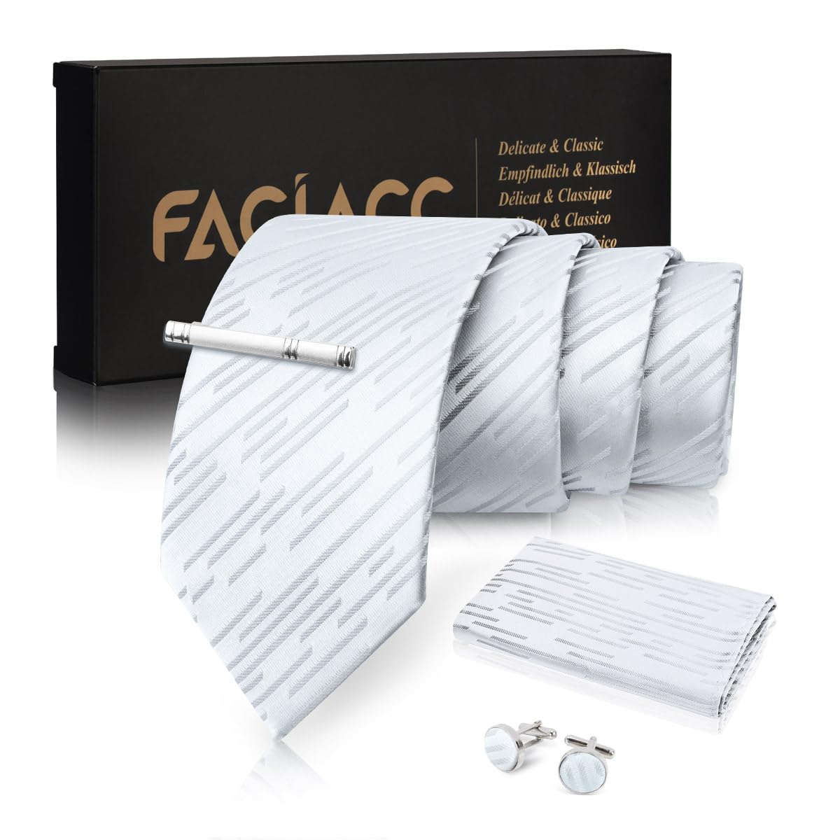 【エレガントなデザイン】ネクタイ本体サイズ: 3.4"× 59"(8.5cm × 150cm)、ハンカチサイズ:12"x 12"(31cm x 31cm)、このFACIACCクラシックなストライプ柄のネクタイはレトロなスタイルとファッションスタイルの完璧な融合です。年齢を問わず、通年お使いいただけます;ご自用はもちろん、絶妙なギフトボックスのパッケージ、新郎と友人とお父さんへの大切な男性への贈り物にも人気のプレゼントです、父の日、クリスマス、バレンタインデー、感謝祭、記念日、誕生日などのプレゼントに最適です。