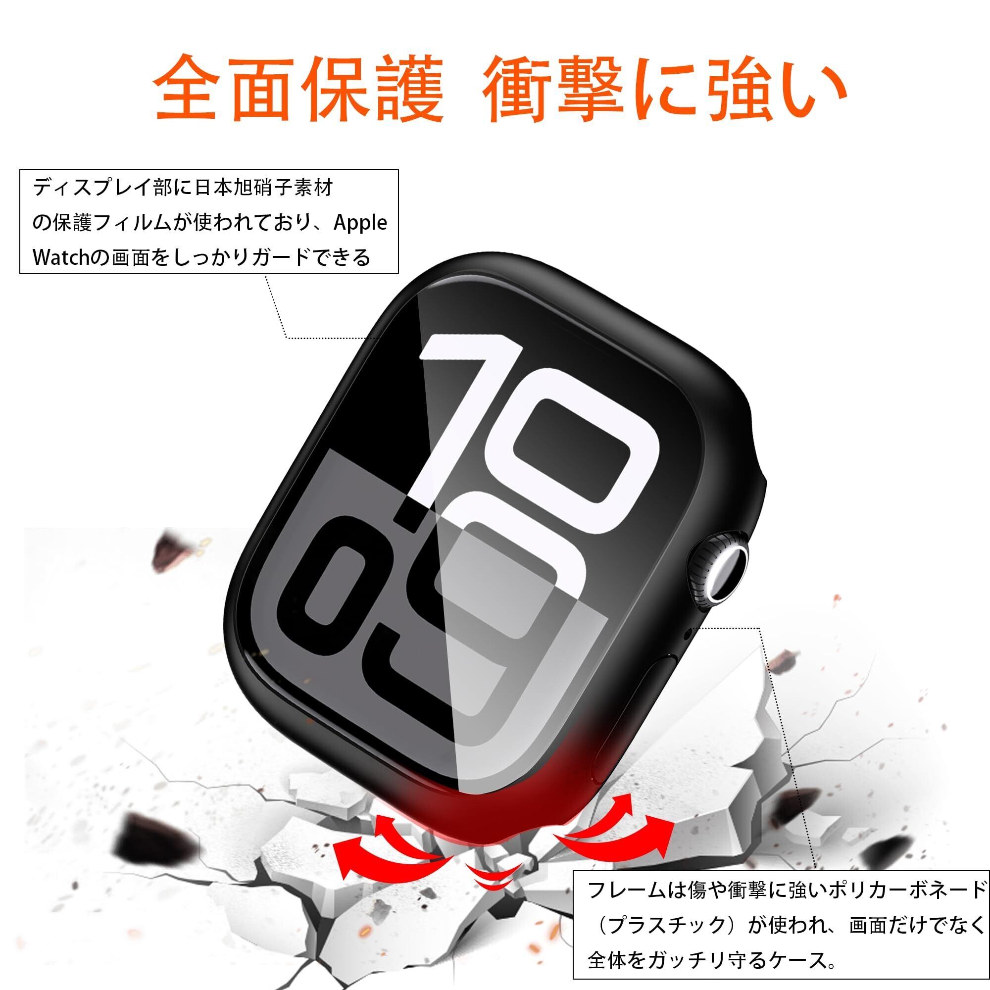 【全面保護&衝撃に強い】 PC素材を使用することで、鍵などによる擦り傷の他、あらゆるダメージからapple watch 10本体を守ります。また、液晶面全体を保護する安心の構造で、普段使い程度の落下では、apple watch 10本体に傷がつくことはほとんどありません。