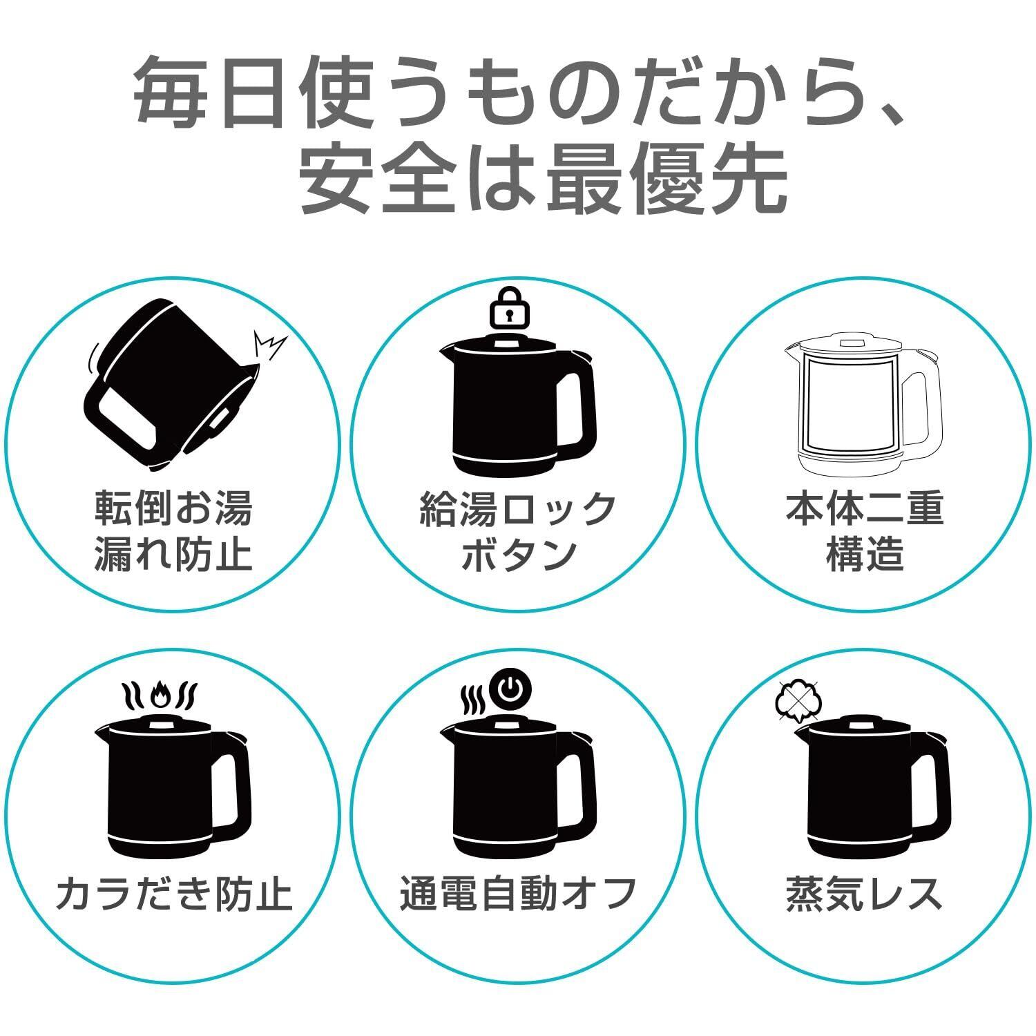 沸とう時間:(約)カップ1杯(140mL)45秒※水温・室温23度、満水(1.0L)5分 / 湯わかし時の消費電力1300W