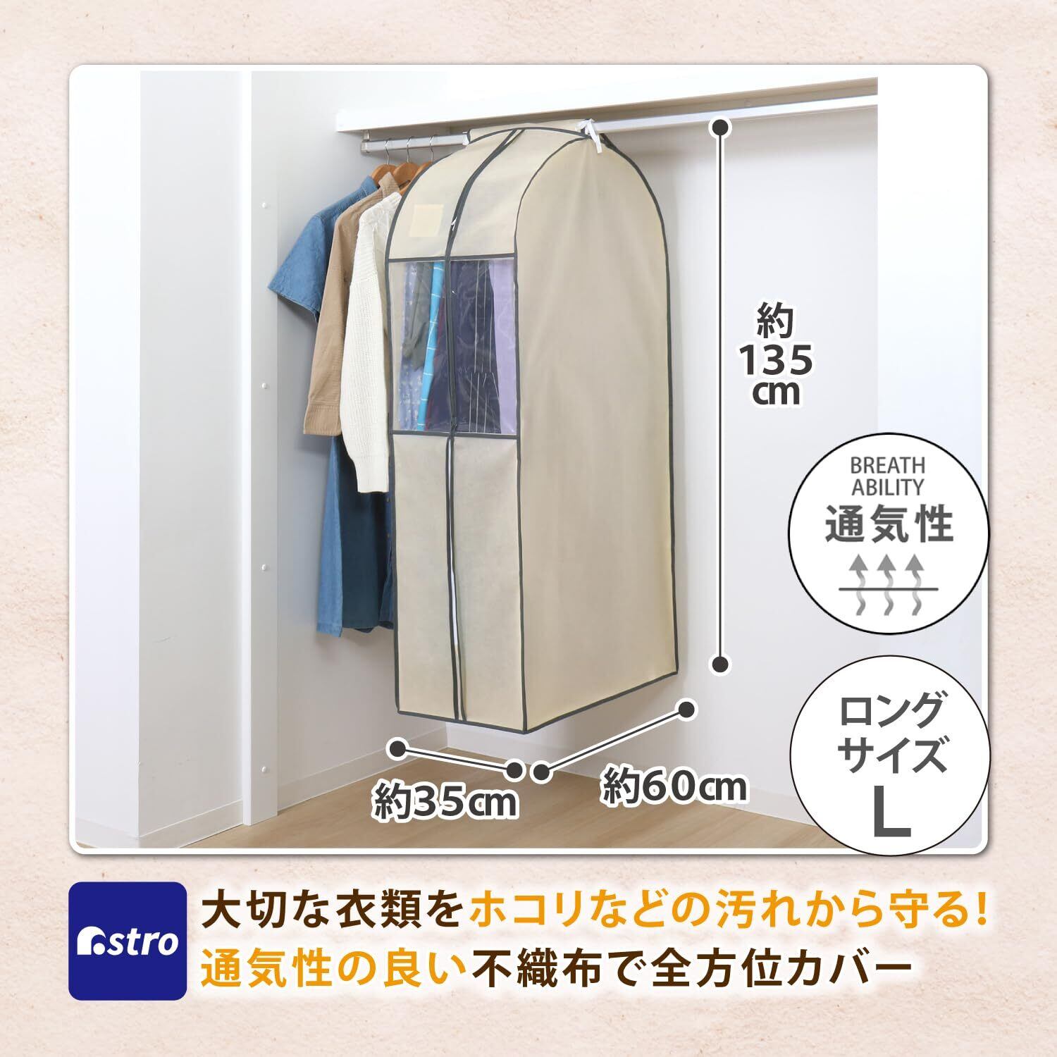 アストロ 衣類カバー ロングサイズ 35cmのマチ付き 吊り下げたまま使えるゆったりシワになりにくいマチ付き洋服カバー 通気性の良い不織布がホコリなどの汚れをガード スーツカバー コートカバー 衣装カバー 吊り下げ収納 ベージュ 131-24