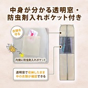 ●大きく開いて出し入れしやすいセンターファスナー。ハンガーに掛けたまま衣類の出し入れができる。中身の見える透明窓と防虫剤用ポケット付き。