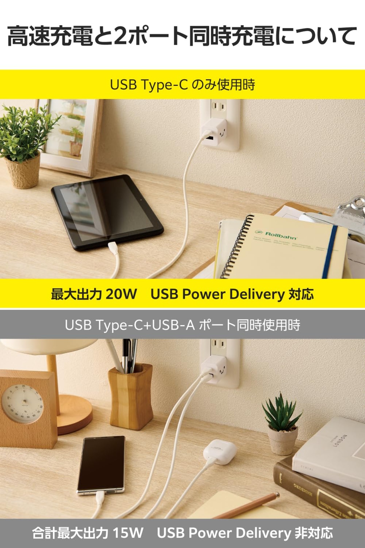 ■定格出力電力:USB Type-Cポート:最大出力20W、 USB-Aポート:12W、2ポート同時出力時:合計最大15W(USB Power Deliveryでの出力はできません)