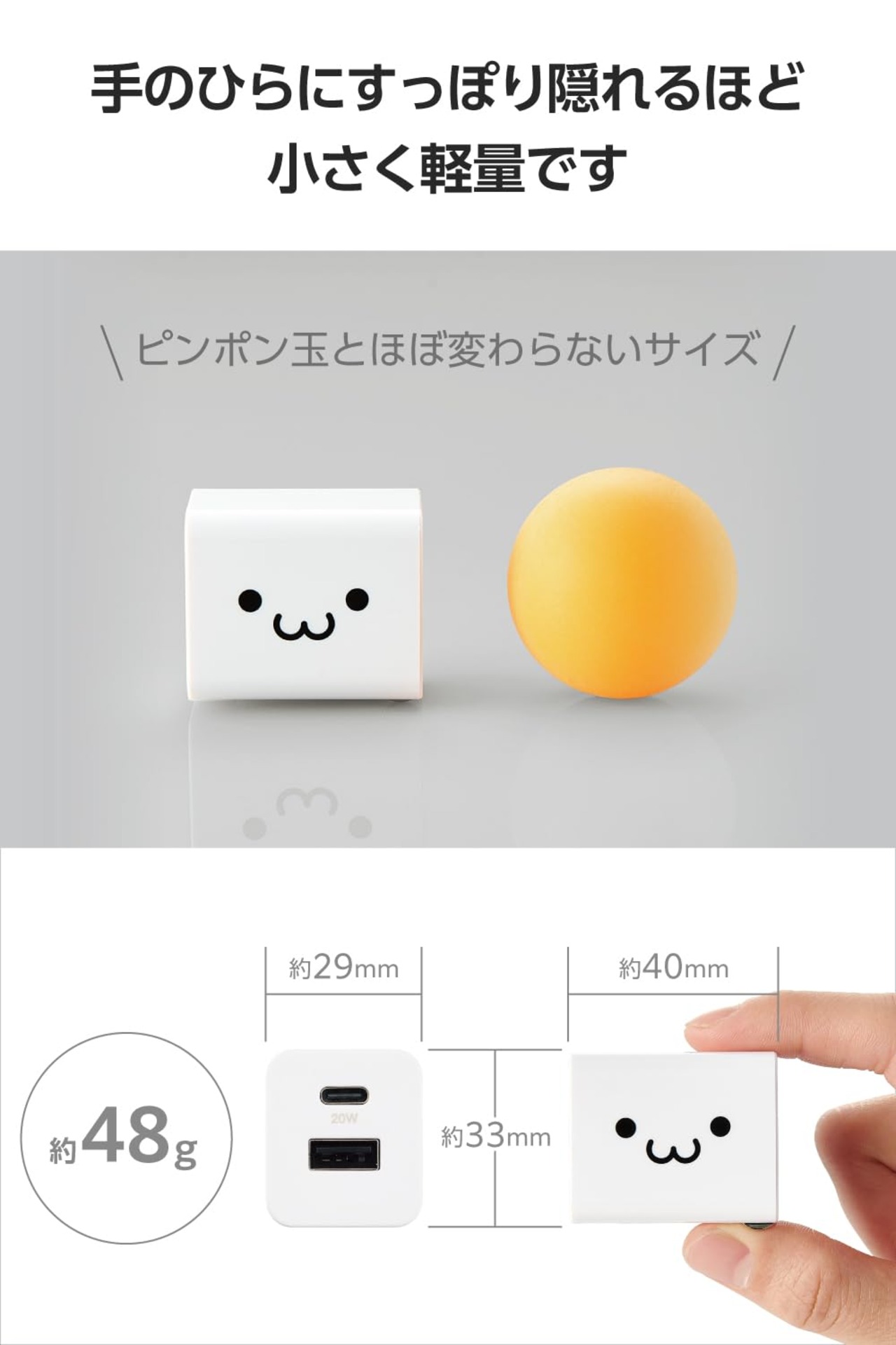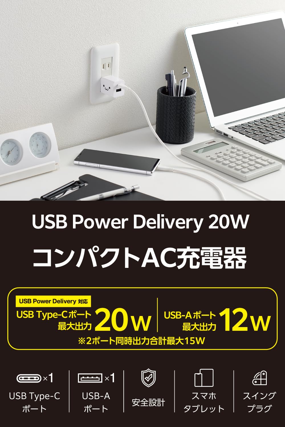 エレコム Type-C 充電器 20W USB PD対応 2ポート USB-C USB-A 【iPhone 16 15 14 Android 等対応】 しろちゃん EC-AC22WF