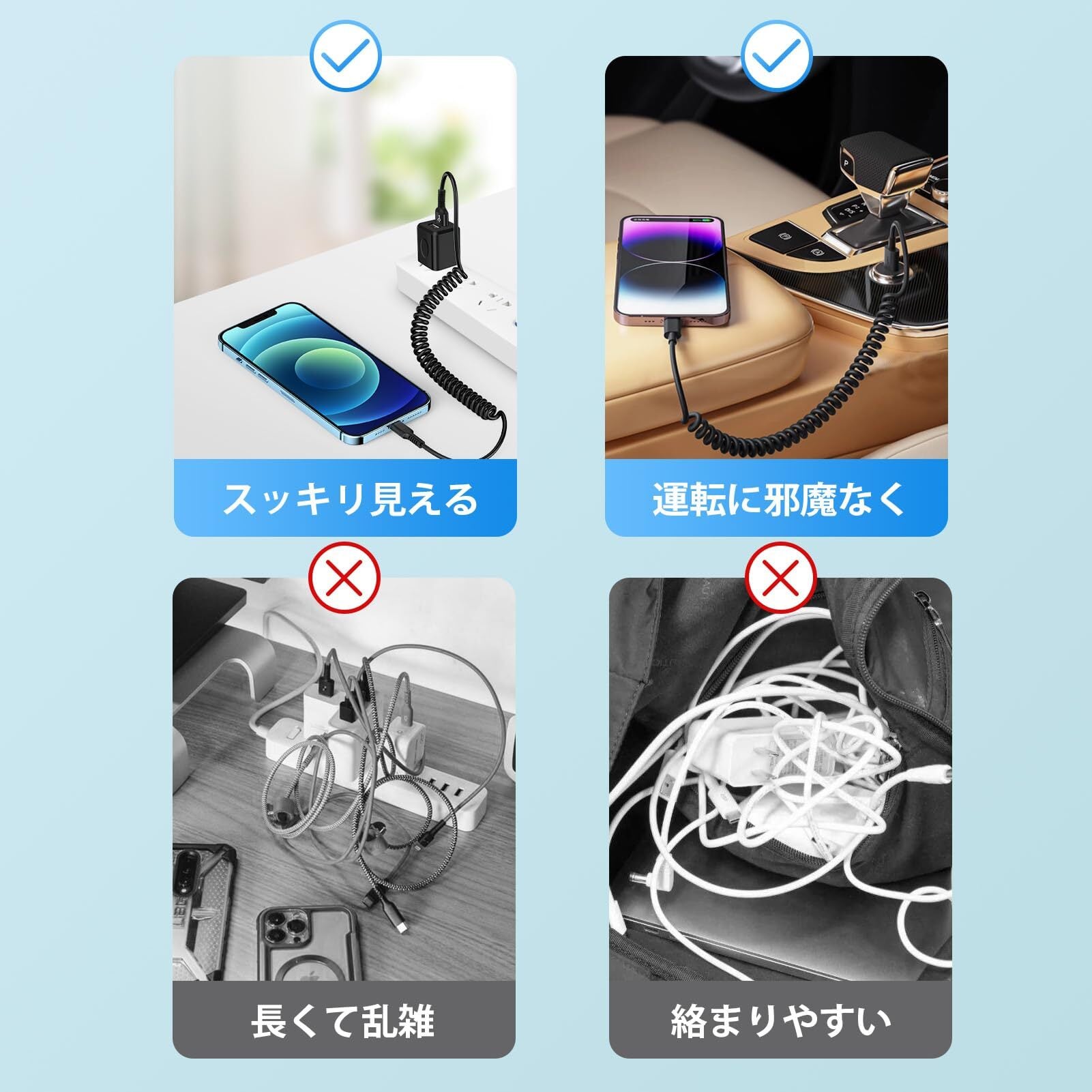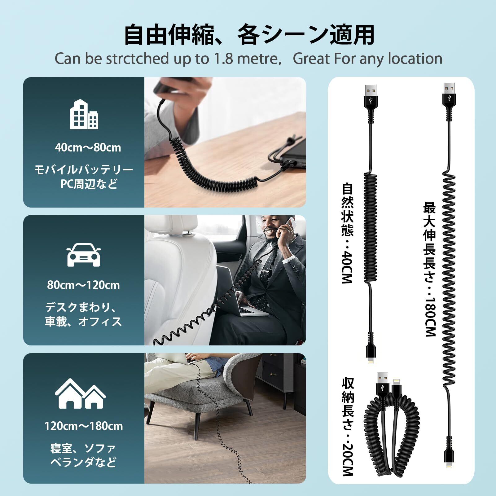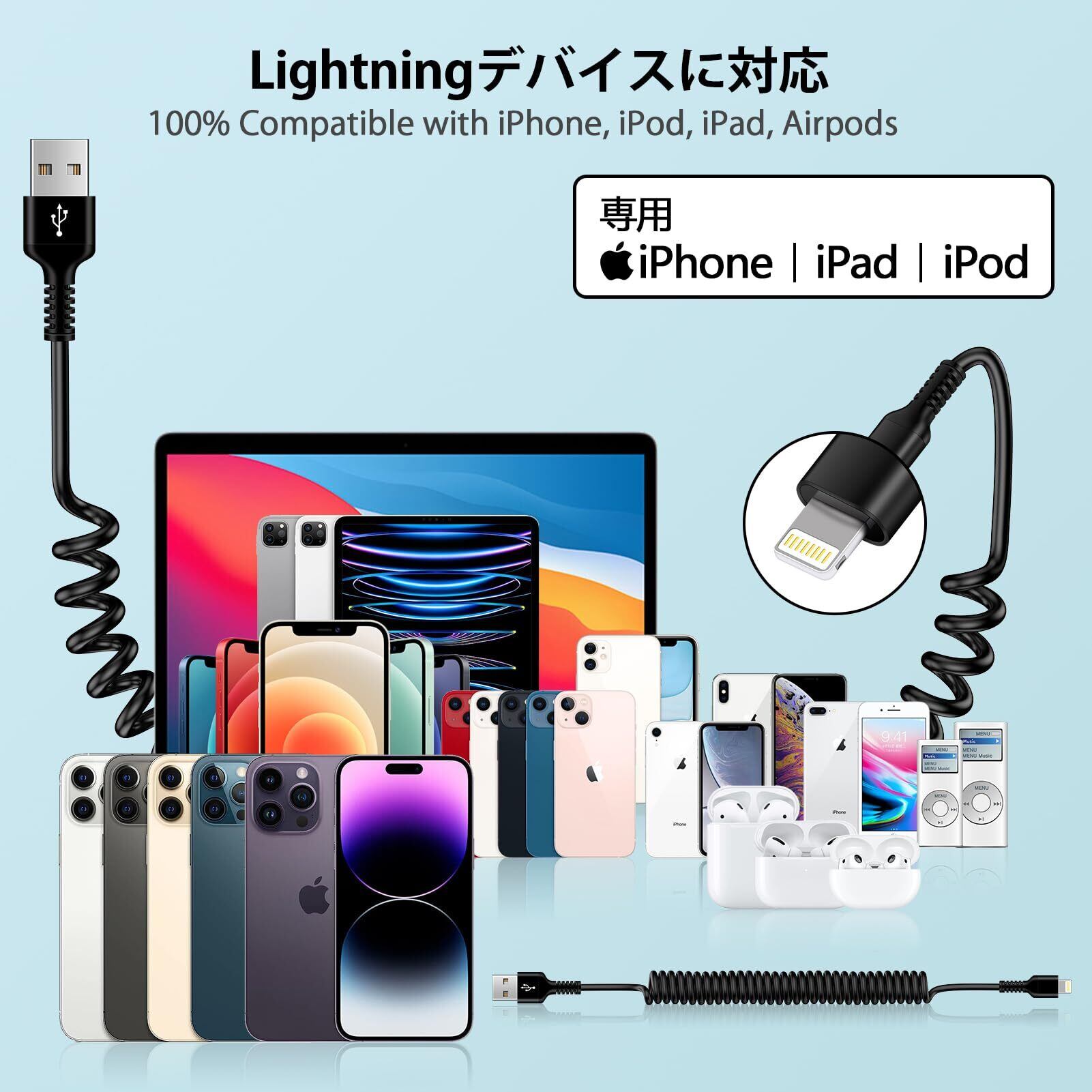 【品質】ライトニング伸縮ケーブル*1本、12ヶ月以内に無償交換或いは返金します。 iPhone/iPad/AirPods/Carplayなどに対応。注:CarPlay機能に問題が発生した場合は、CarPlayに接続する前に、コイル型iPhone充電ケーブルを再挿入し、Lightningコネクタを逆にしてみてください。さらにご質問がある場合は、お気軽にお問い合わせください。