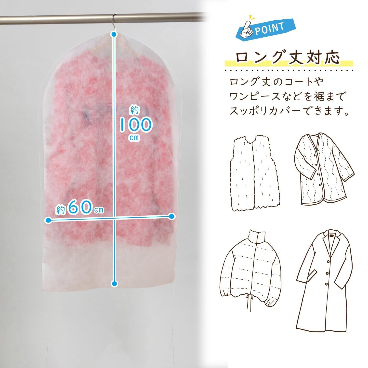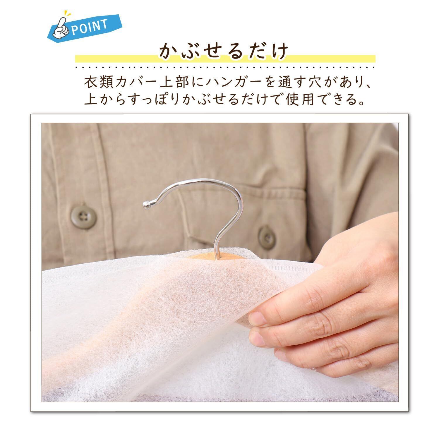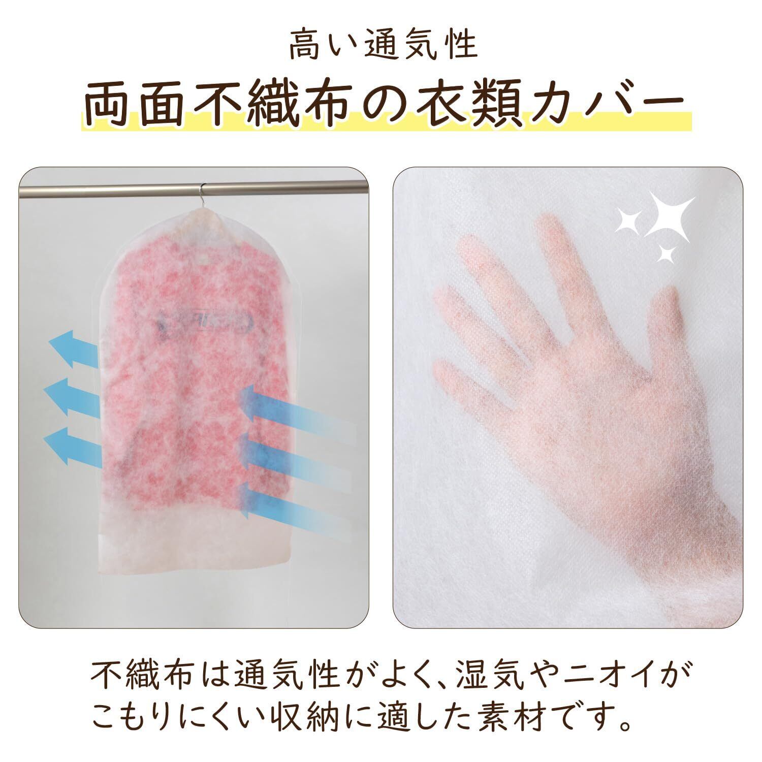 通気性に優れた不織布製:空気がこもるのを防ぎながら、大切な洋服をホコリなどの汚れからガードします。
