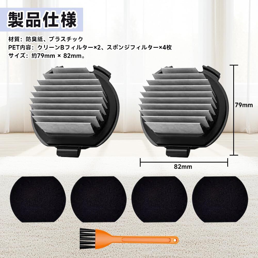 【製品仕様】材質:防臭紙、プラスチック、PET内容:クリーンBフィルター×2、スポンジフィルター×4枚 サイズ:約79mm × 82mm。