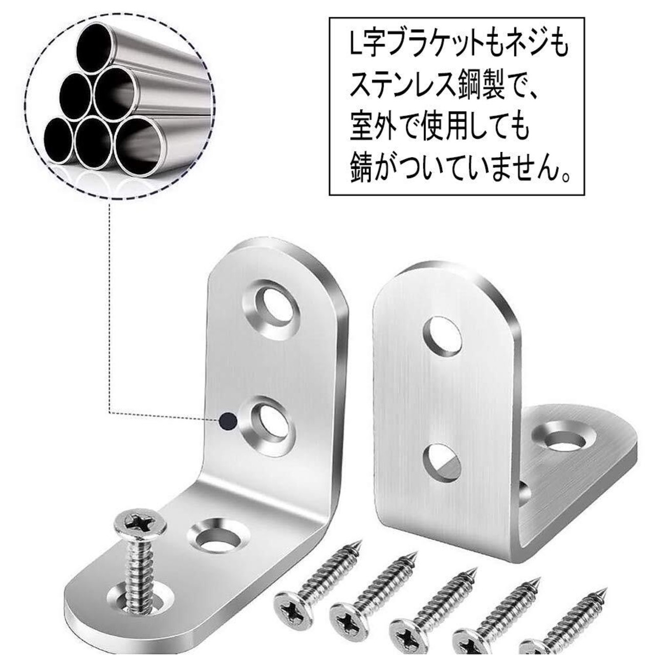 【材質】L字ブラケットもネジもステンレス鋼製で、(塗料ではない)室外で使用しても錆がついていません。内側にはプラスチックフィルム(使用時に引き裂く)があり、表面にはめっき処理がなく、バリがあるので、指を傷つけないように注意して使用してください。