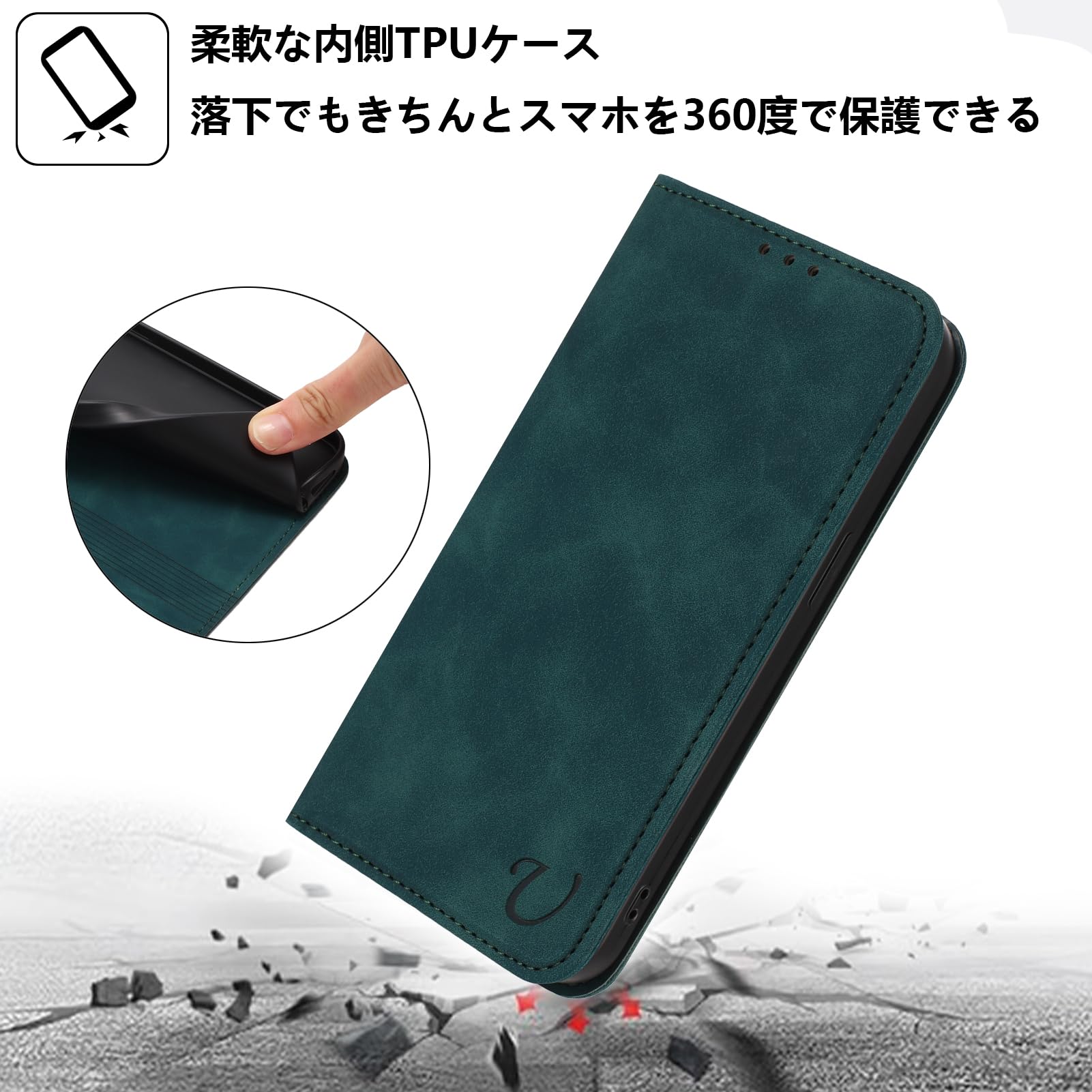 【マグネット内蔵 全面保護】マグネット内蔵の手帳型式で、カバーを閉める時、片手で簡易に開閉することはできます。外側は高品質のPU製で、落下時の衝撃を効果的に吸収してスマホへの直接的な外力を防げるようになっています。内側は柔軟性あるTPUケースで、二重の保護として機能します。破損することはありません、衝撃から本体を各方向で360°保護します。