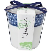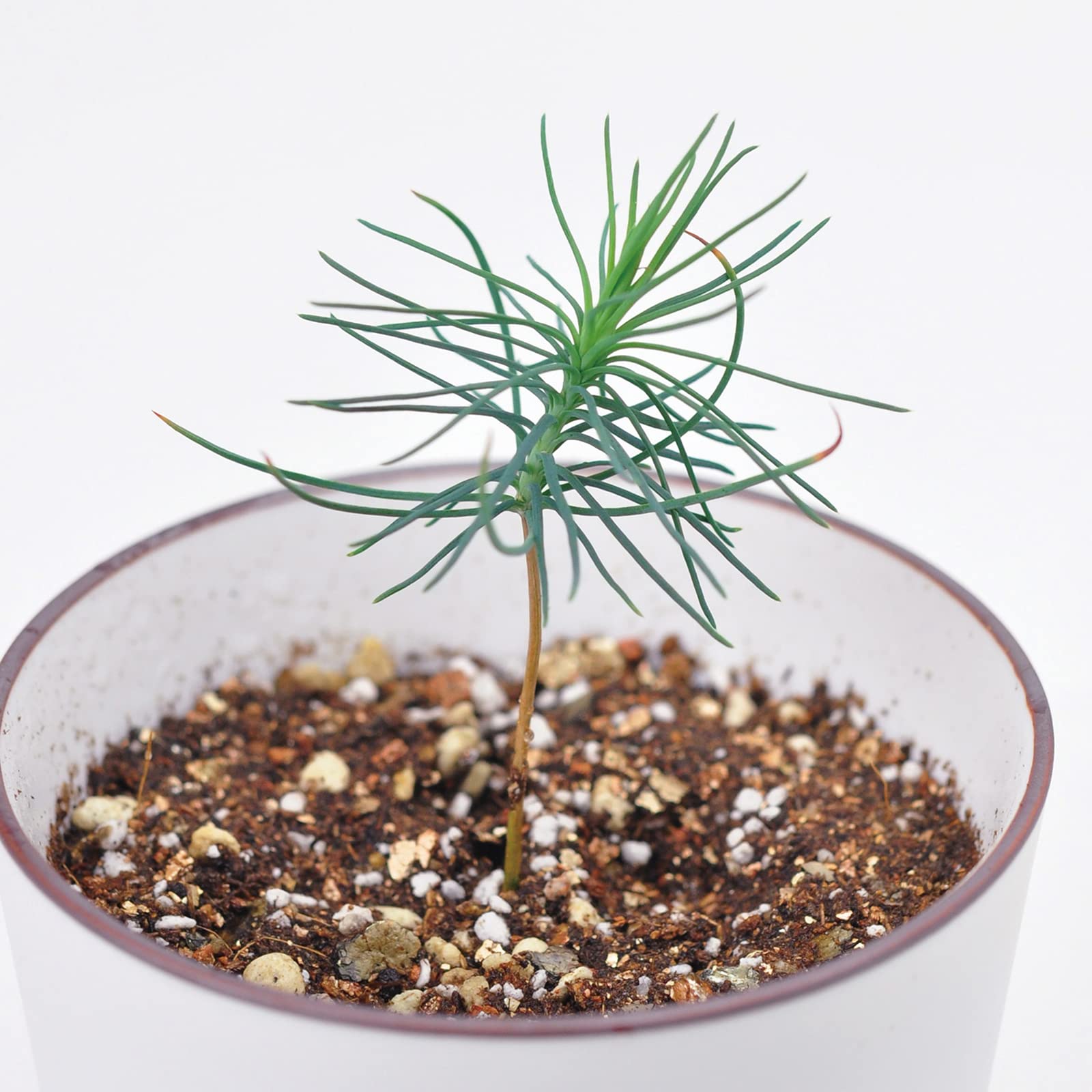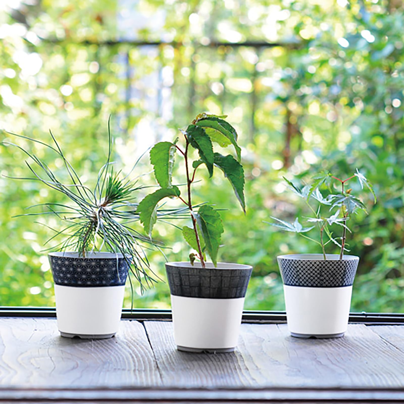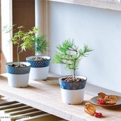 細やかな藍色の小紋がデザインされた染付けの器で黒松を育てる栽培セット