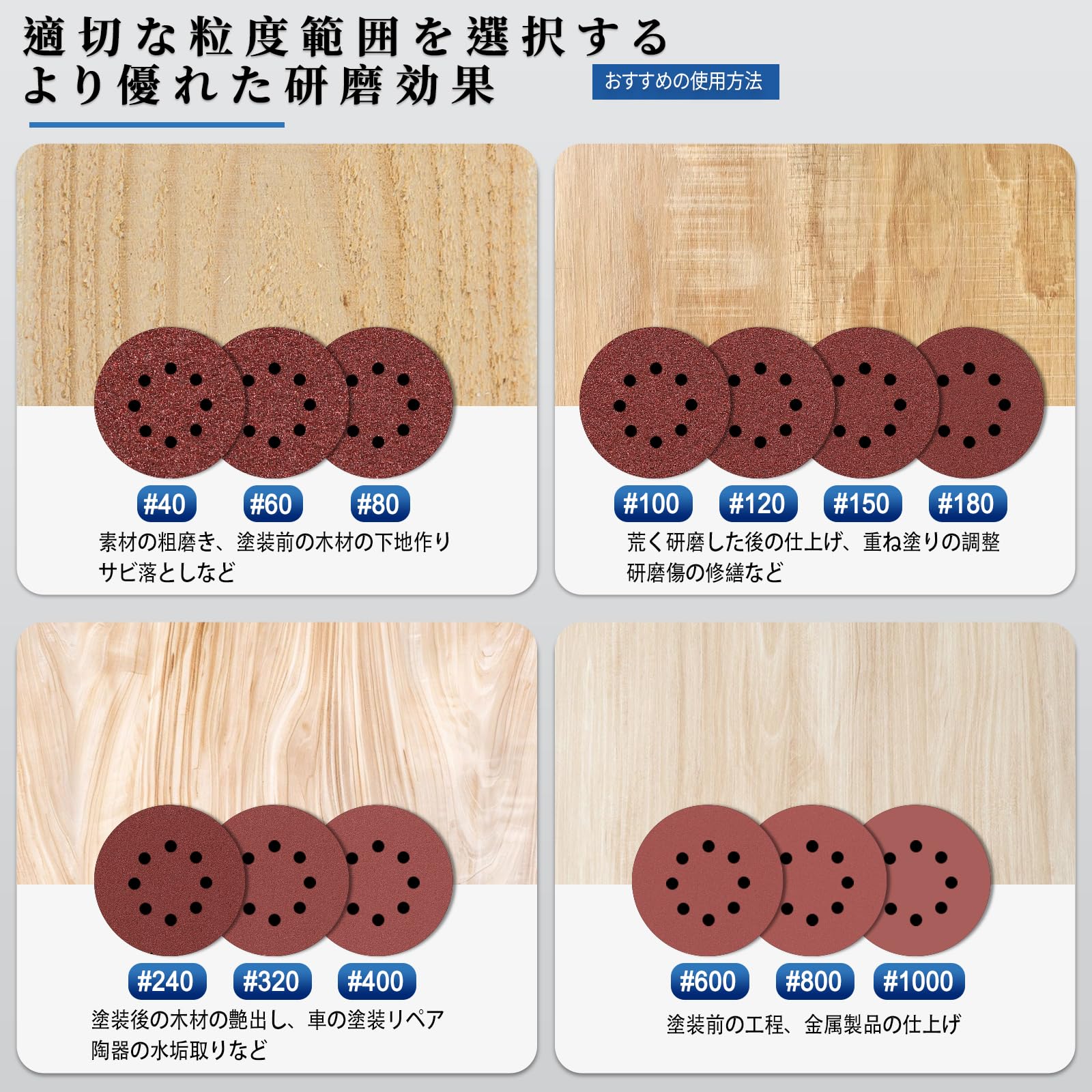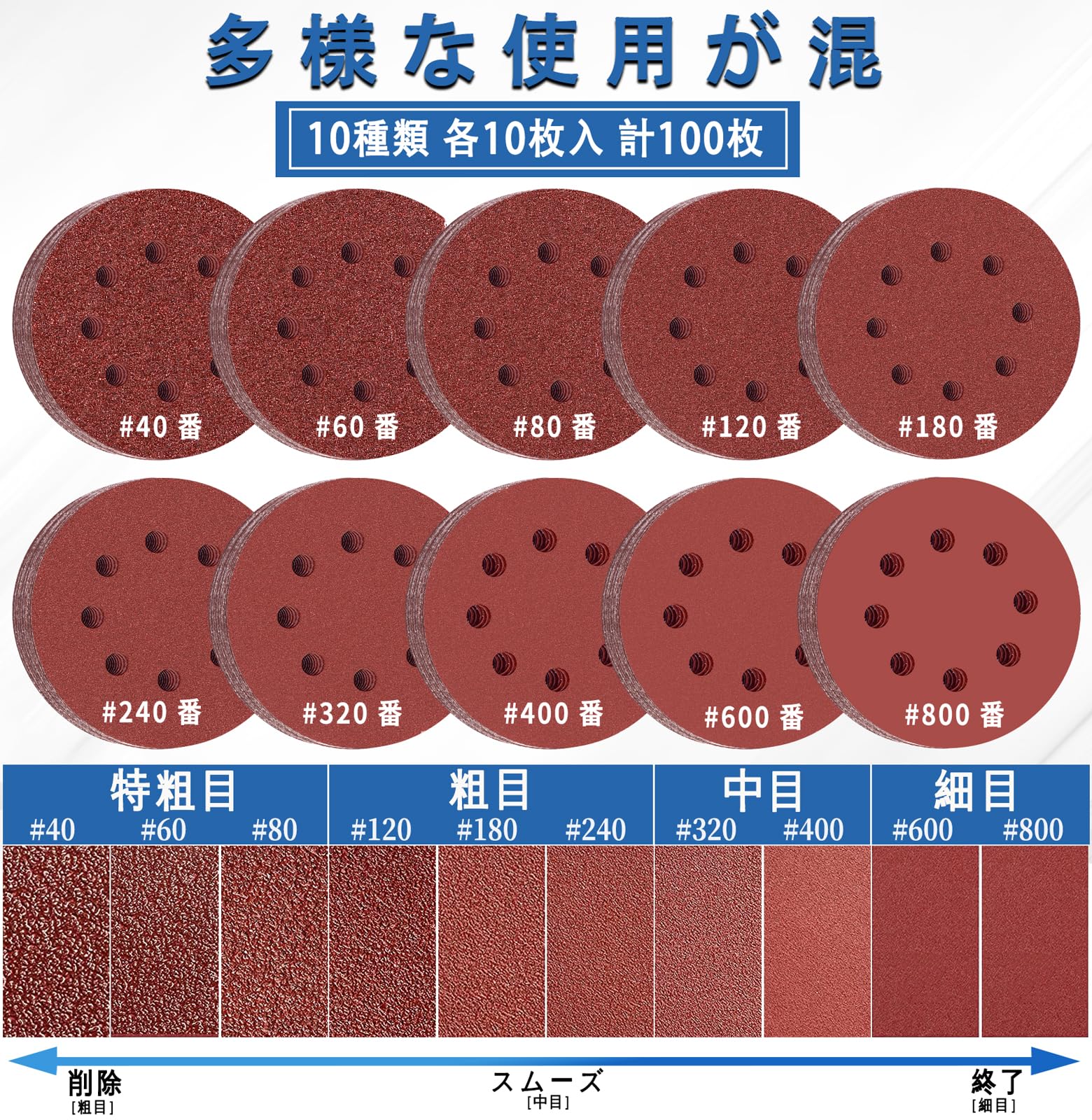 【ほとんどのニーズをカバーする砥粒】100枚サンダーペーパーセット 粗目から細か目まで 各10枚#40/#60#80/#120/#180/#240/#320/#400#600/#800 コスパ抜群、種類多い-すべての研磨要件を満たすのに十分