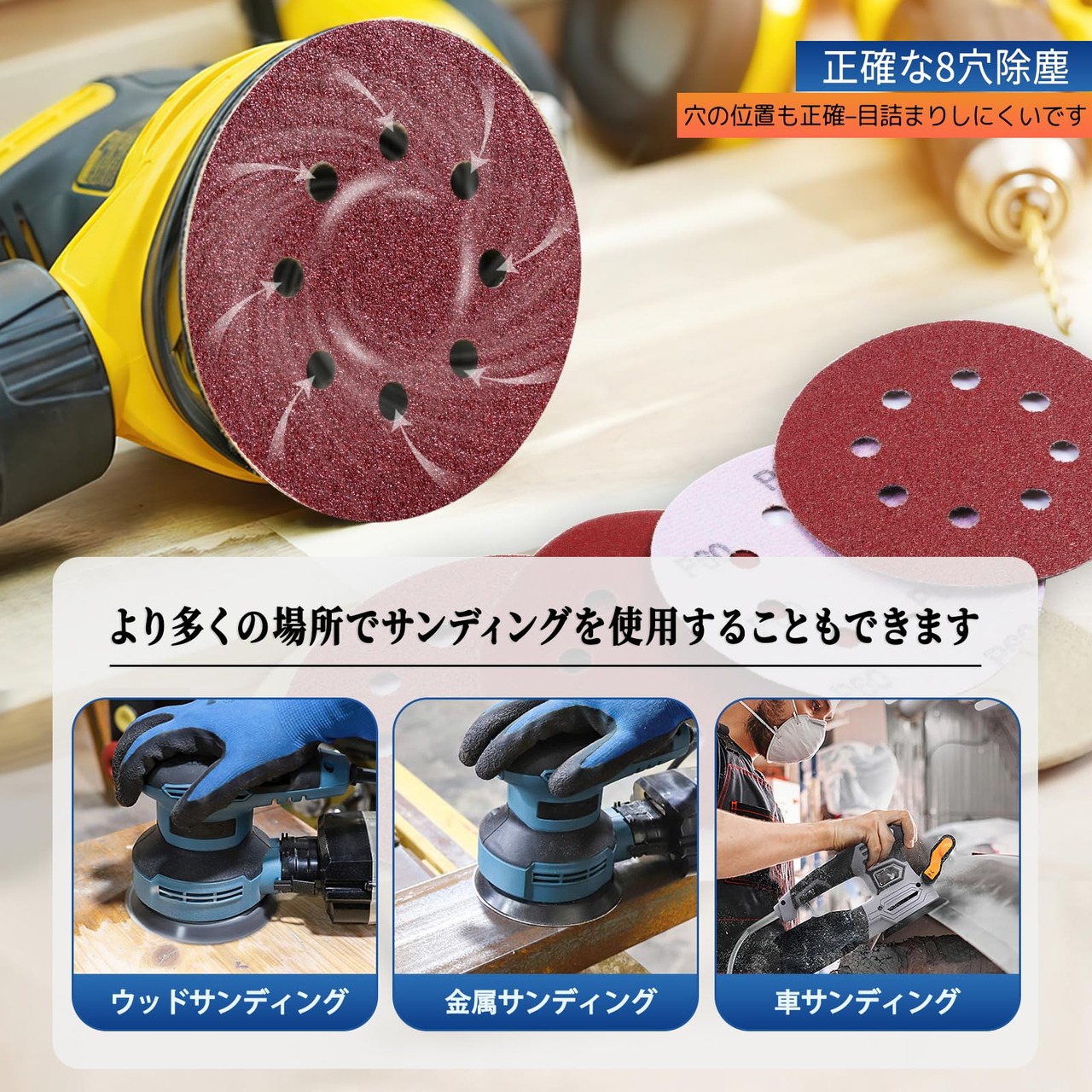 【使いやすさマジックテープ式】脱着が簡単です 密着性に優れ、高速で耐久性のあるサンディングを提供することで、作業時間を節約し、集塵用に8つの穴を事前に打ち抜きます 穴の位置も正確でした目詰まりしにくいです
