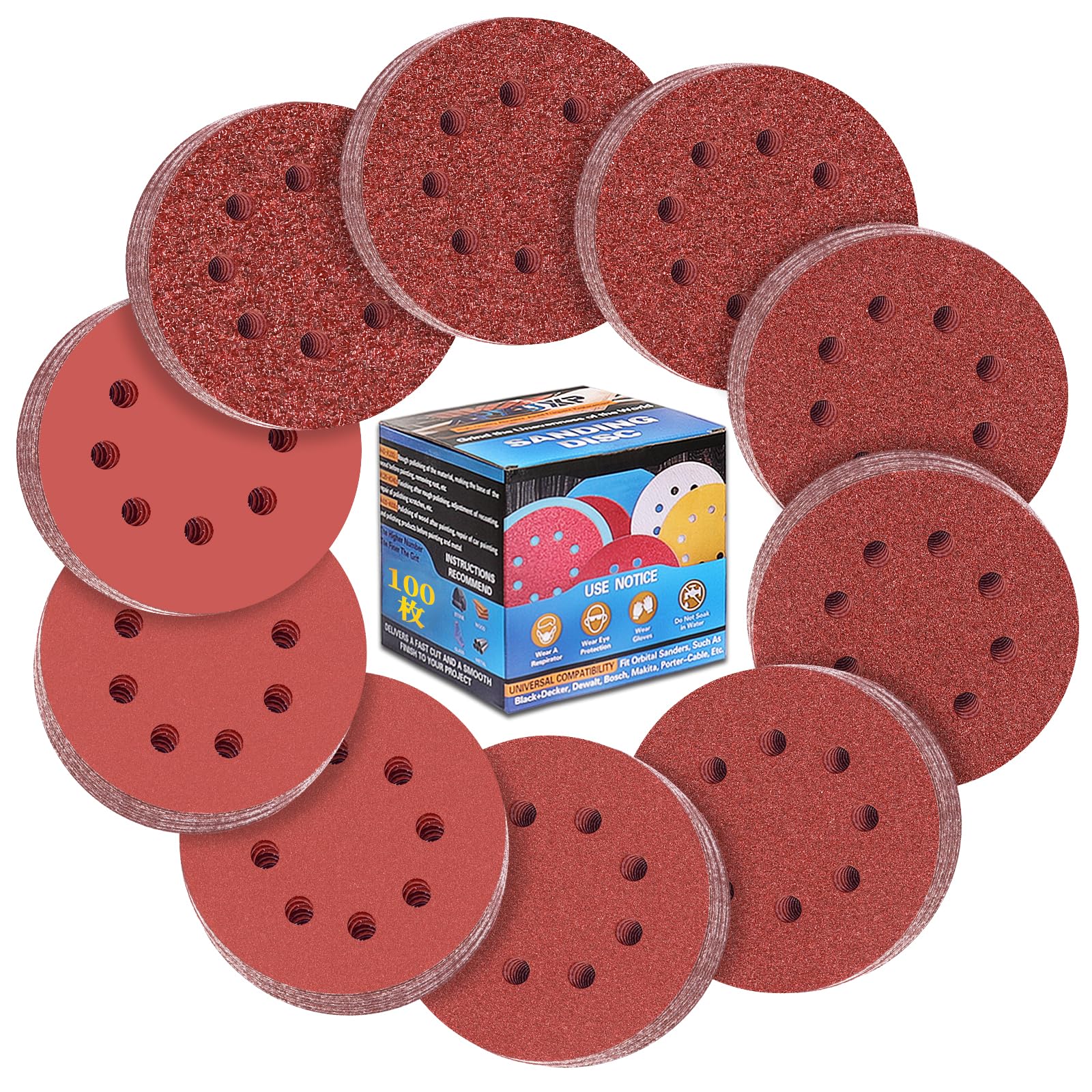 IROKCAKPT ディスクペーパー 125mm サンダー ペーパー 丸型 8穴 マジック式 サンディングディスク 100枚入セット(#40/#60/#80/#120/#180/#240/#320/#400/#600/#800 ×各10枚)ランダムサンダー用サンドペーパー木工DIY作業に 金属磨き