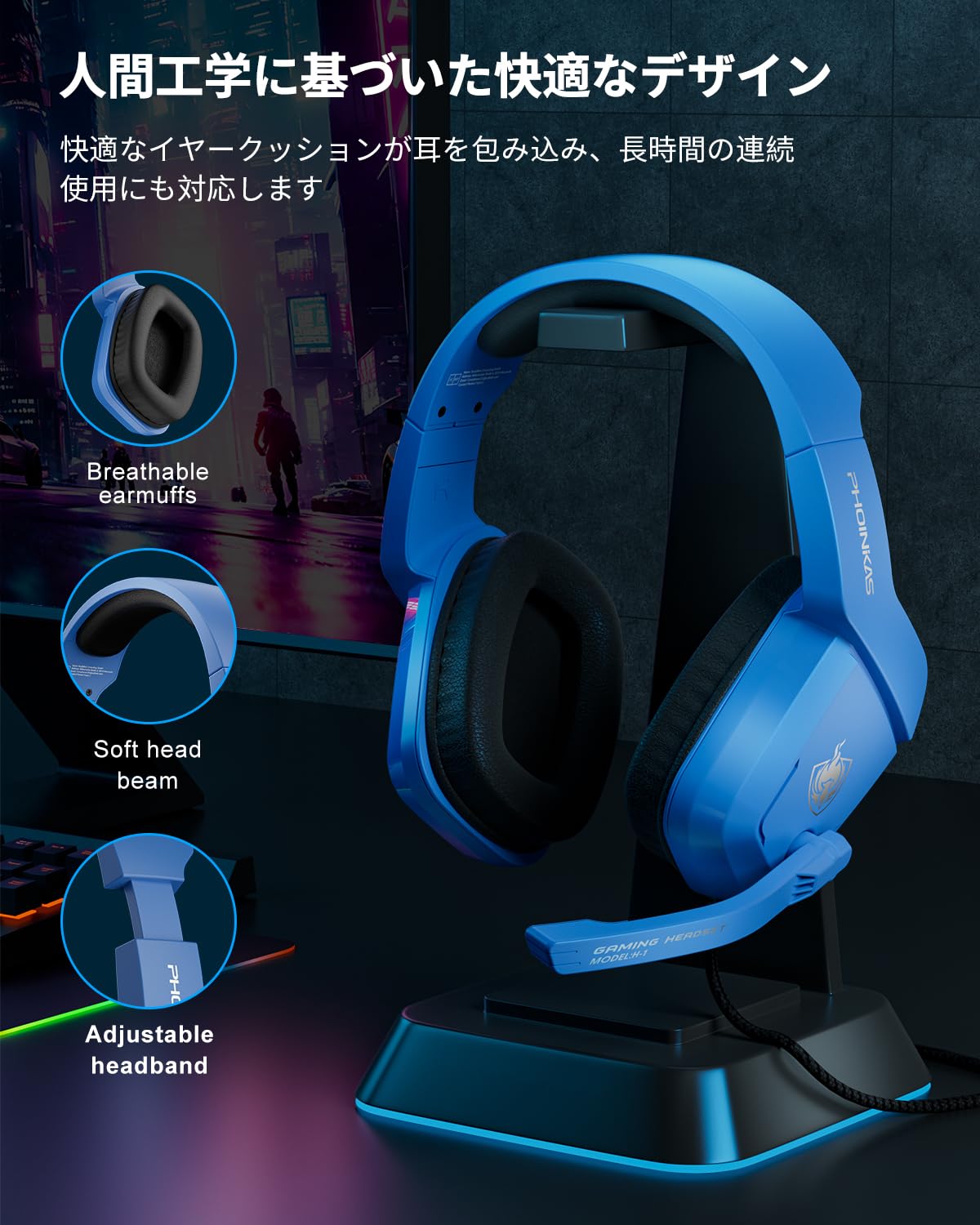 人間工学&快適:付け心地のいいゲーム用 マイク付きヘッドセット :肌に優しい革素材を採用されるイヤーマフ、優しく耳を包みこむことで、長時間使用しても耳が痛くない。頭頂部も柔らかいイヤークッションを装着し、弾力性強くて、頭のサイズを問わず、誰でも気軽く使えます。印象的なLEDデザイン、様々なゲームの雰囲気を盛り上げます。