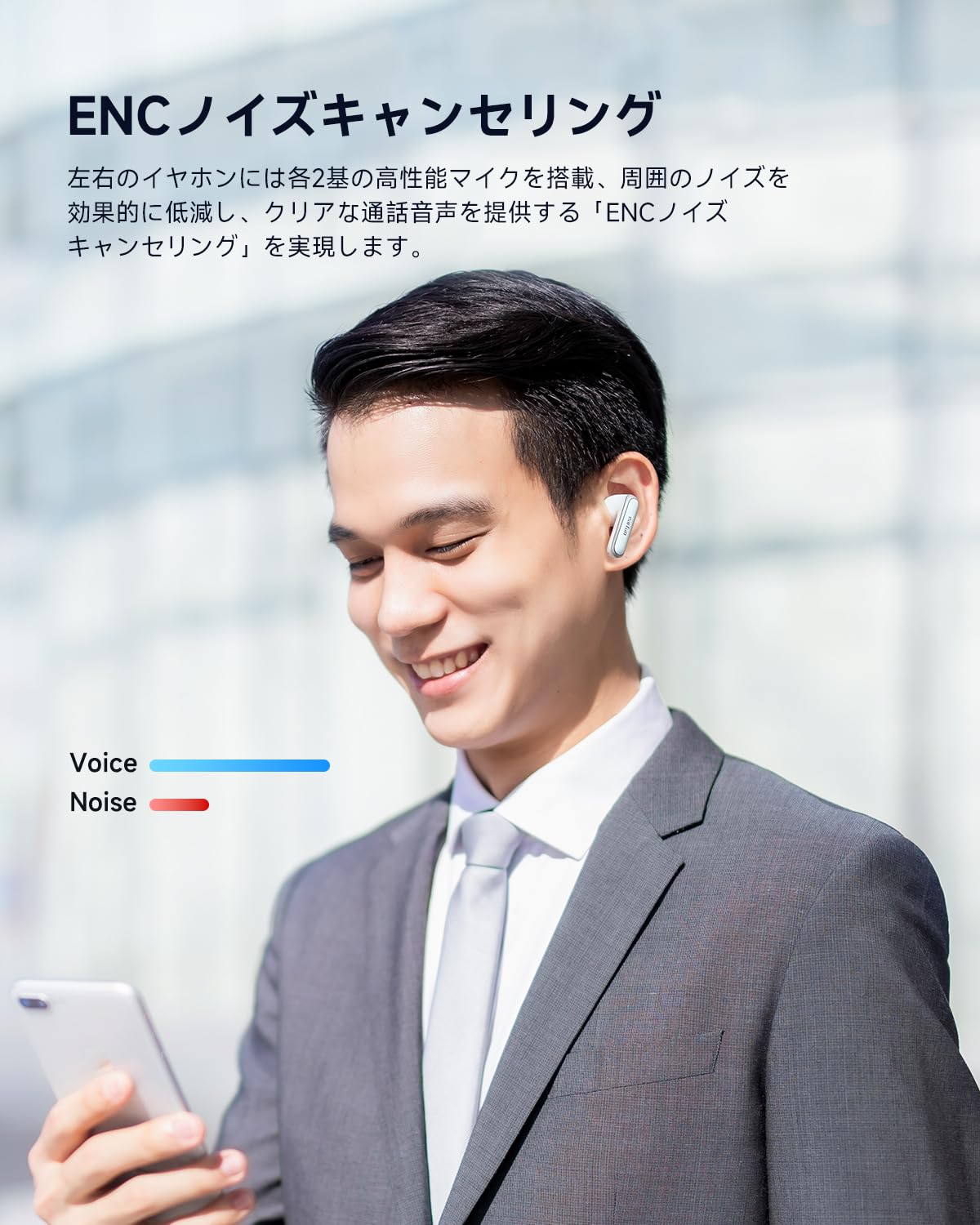 【圧倒的な音質体験】10mm径ウール複合ダイナミックドライバーダイナミックドライバーを搭載し、精緻でバランスの取れた音を楽しめます。クリアなボーカル、力強い低音、伸びやかな高 音がほどよく調和し、奥行きのあるサウンドステージを実現します。【ENC通話ノイズキャンセリング】高感度マイクを左右のイヤホンに各2基/計4基搭載、ENCノイズキャンセリングにより周囲の雑音を取り除いたクリアな通話を実現します。自動車の走行音や風の音など、90%以上の環境音を排除することができます。