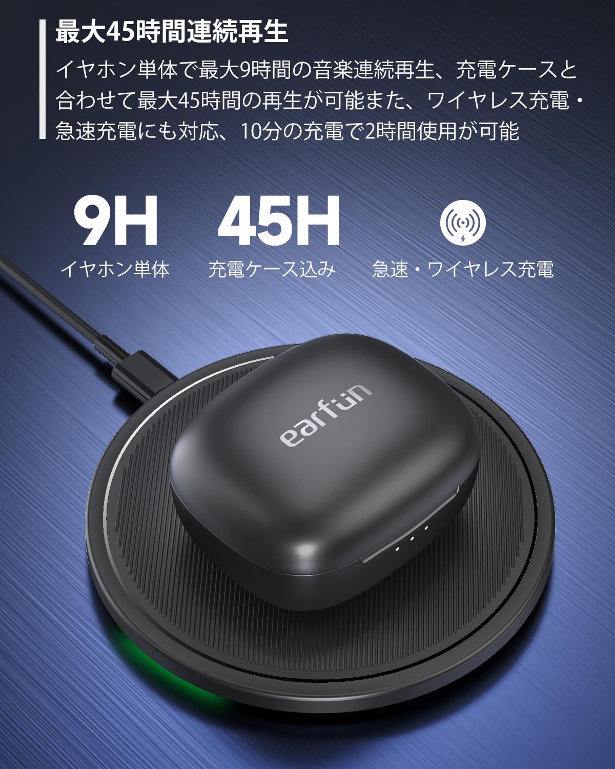 【45時間連続再生】イヤホン単体で最大9時間の音楽連続再生、充電ケース込みで最大45時間の再生が可能です。また、ワイヤレス充電・急速充電にも対応、10分の充電で2時間の使用が可能です。イヤホンや充電ケースを長く使うには、定期的に綿棒やウェットティッシュでイヤホンやケースの充電コンタクターの汚れを定期的に掃除してください。