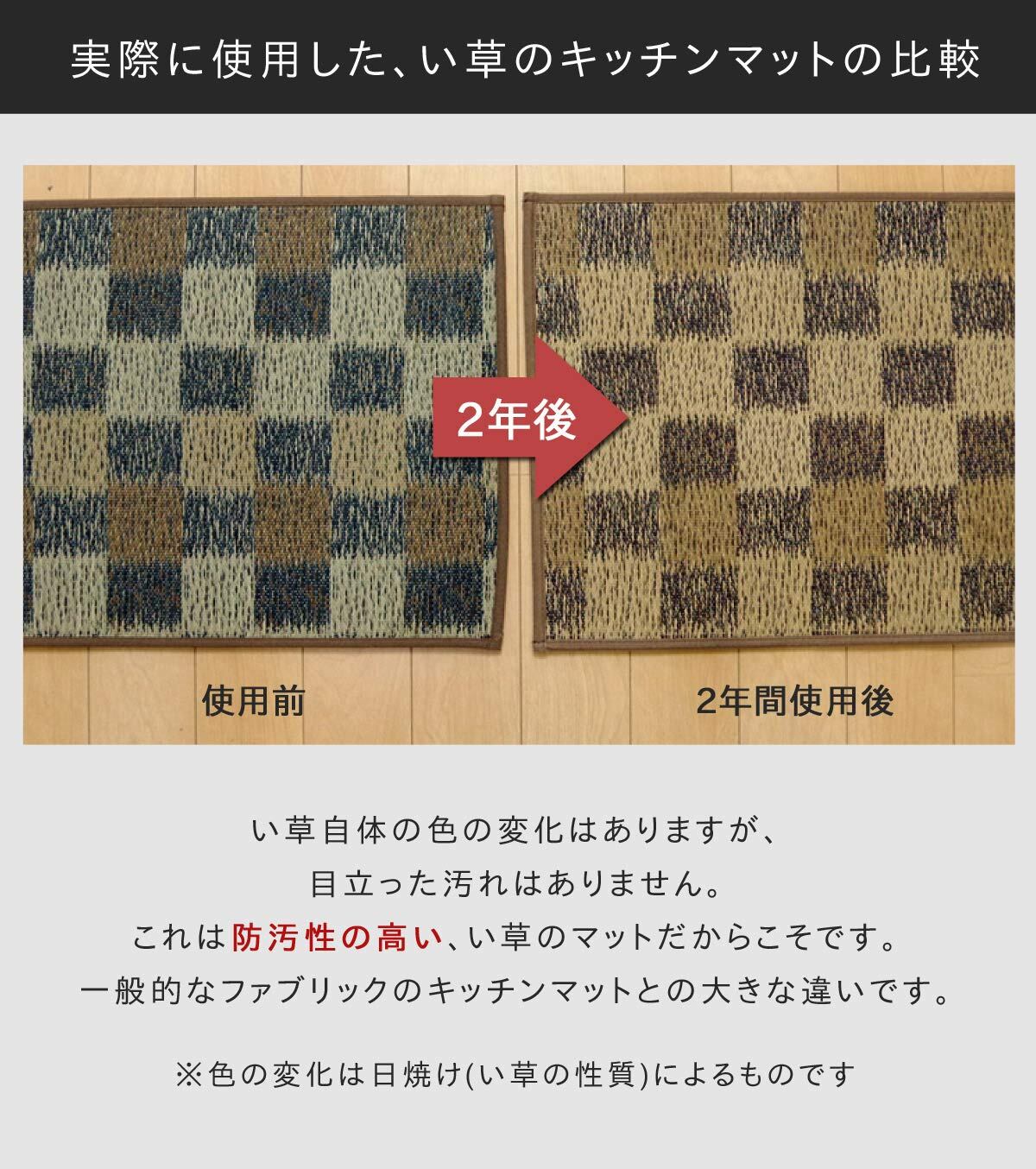 い草のキッチンマットです。キッチンマットの不満を解消してくれる商品です。化繊もののキッチンマットと比べ、汚れにくくシミになりにくいです。小さなゴミでも、ほうきで掃く、掃除機をかけるだけで取り除くことができます。い草自体が持つ油分により汚れを弾くので洗う必要がなく長くご使用いただけます。裏地には国産のウレタンフォームを使用することで,丈夫でクッション性があり滑りにくくしました。