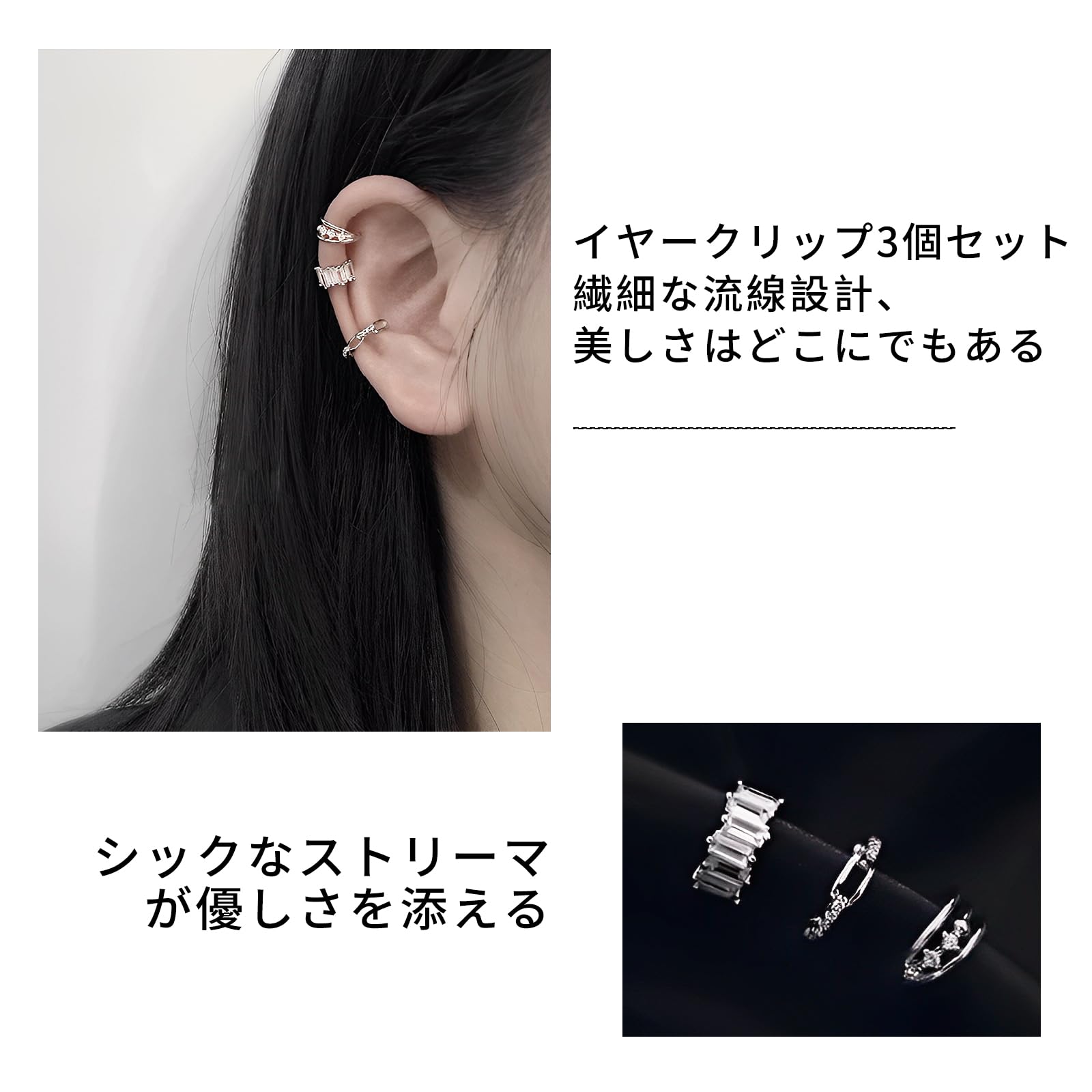 【イヤークリップセット】単体でも重ね付けでも様になるイヤークリップが3個入ったセットです。 組み合わせ次第で、よりファッショナブルなトレンドへと導きます。