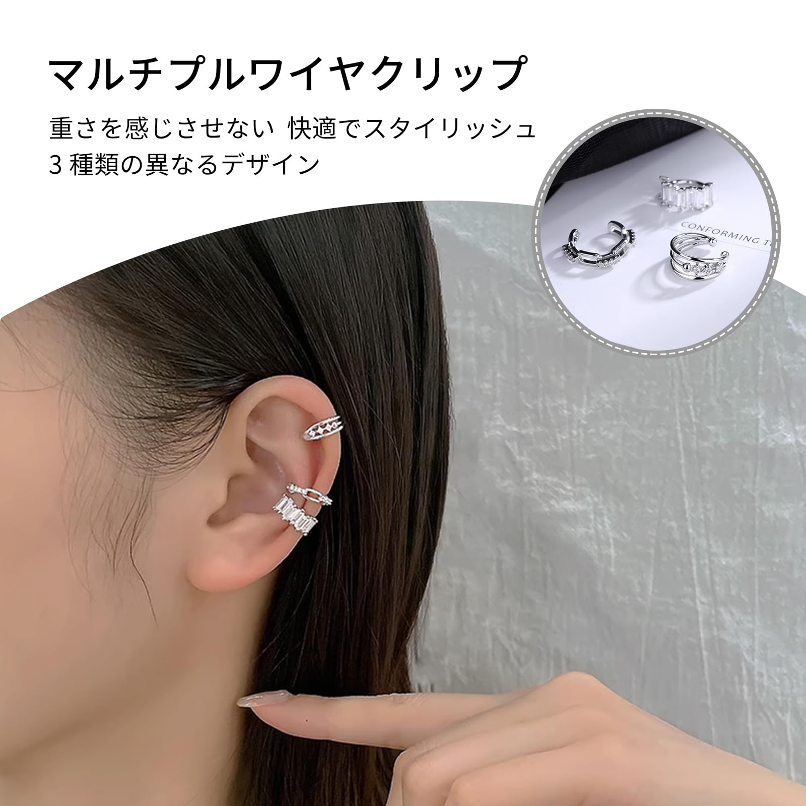 【イヤークリップ】は、ピアスの有無にかかわらず、痛みのないパンチングを実現します。単独で、並べて、お好きなように装着できます。 "