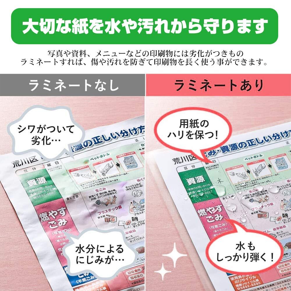 【A4まで対応に&】最大A4(210mm)サイズまで対応ので、A4サイズ、カード、名刺、ハガキサイズの紙等を丁寧に置かなくても簡単に加工できるラミネーター機です。ラミネートを施していない写真はしわや傷、色落ち、カビなどが出やすいです。このようにすると写真の保存が不完全になります。 ラミネートフィルムは、水、油、化学物質、雨にも強いプラスチックです。 ラミネートを施した写真は、こすりや汚れ、防水、湿気を防ぎ、しわが出にくいです。家で面白い家族写真、或いは、恋人との写真を長く保存したり、写真や貼られたメモリーを綺麗に飾りたりするとき、及び、貴重な業務書類、設計図などを水などの外部危険要素から避けるために、ラミネーター一台でお客様の協力になれます。ご注意:本製品がただ9枚のラミネートフィルム、1冊の説明書と1台のラミネート機械が付属されます。