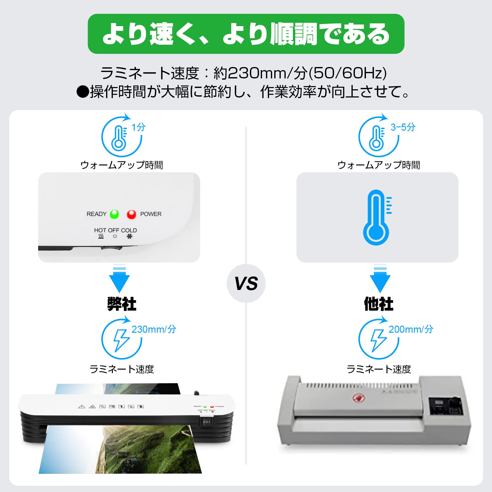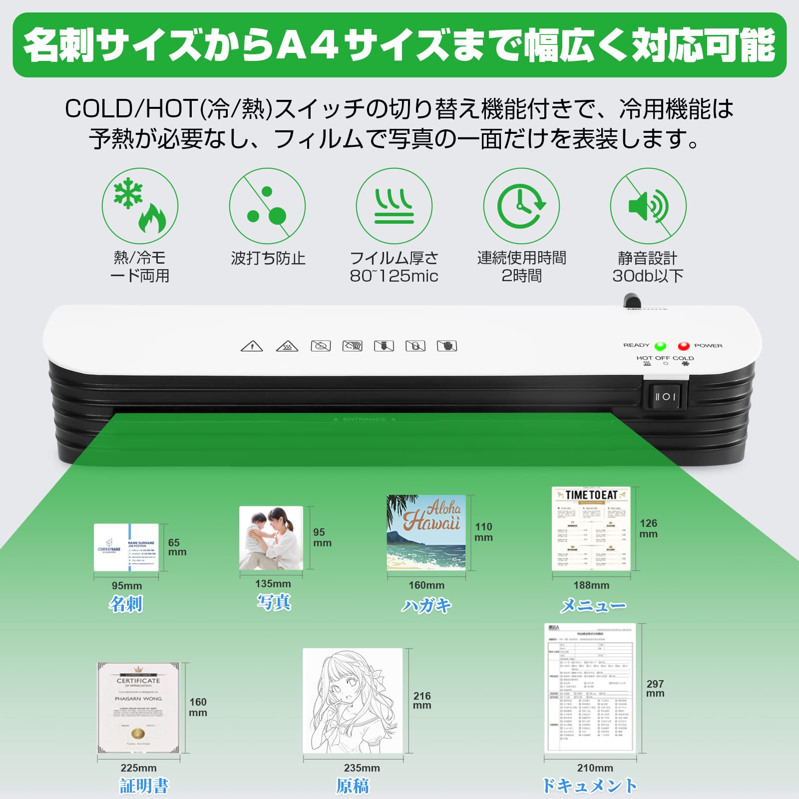 【60分連続作業、冷熱両用】約2-3分ぐらい予熱して、無駄な時間がかかりません。そして、60分連続作業可能で、作業効率が向上します。COLDとHOT(冷/熱)スイッチの切り替え機能付きで、写真や感熱纸など今までラミネートできなかったものも大丈夫です。COLDとHOT(冷/熱)状況に合わせて使えるます。 加熱時間が短く、とても使い勝手がいい物です。注意:付属したフィルムはすべてHotの専用フィルムです、Coldのフィルムは別売り必要です。