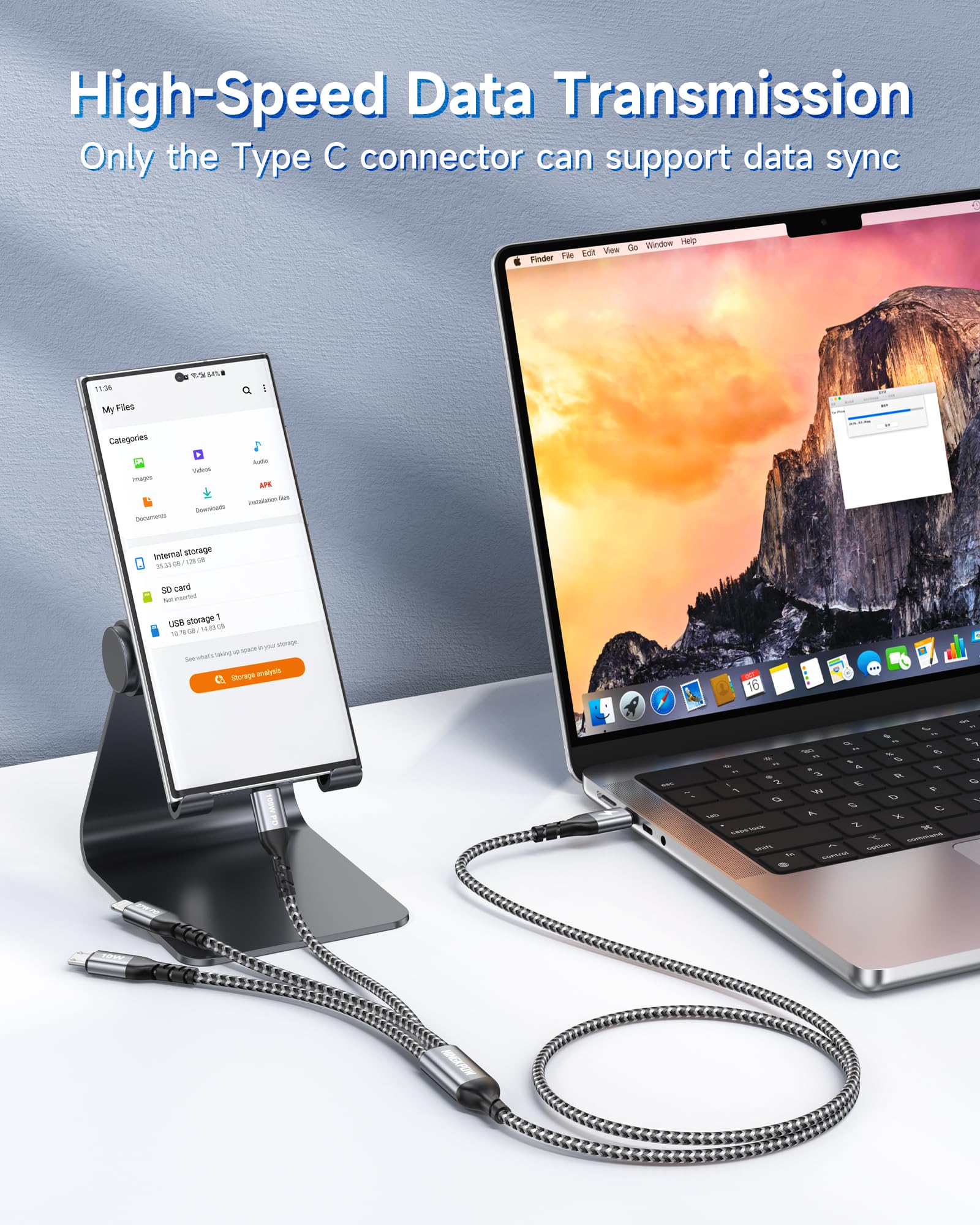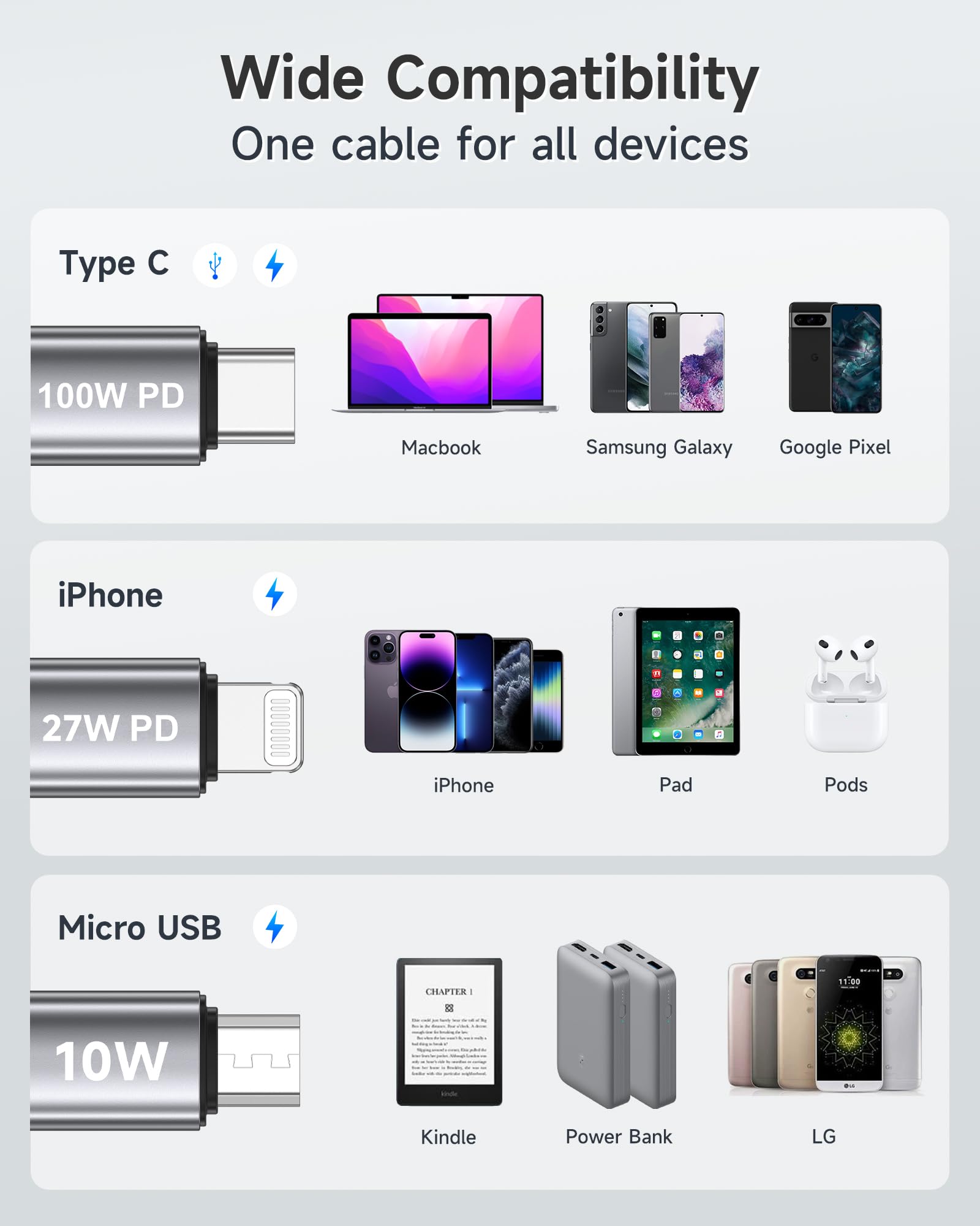 【ユニバーサル互換性】100W 3in1 急速充電ケーブルは、iPhone 16/15/14/13/12/11/Pro Max/XR/XS Max/XS/X/8Plus、MacBook Pro16/14/13 (2023)、MacBook Air 13 (2022)、Pad Pro 12.9 (2023)、Pad Mini、Pad Air、Google Pixel 2/2XL/3/3XL/7/8、Samsung Galaxy S24/S23/S22/S21/S10/S9、Note 20/10、P60/P50/P40/P30/、Mate 60/50/40、Honor、Nexus、HTC、LG、PS4 などに対応しています。