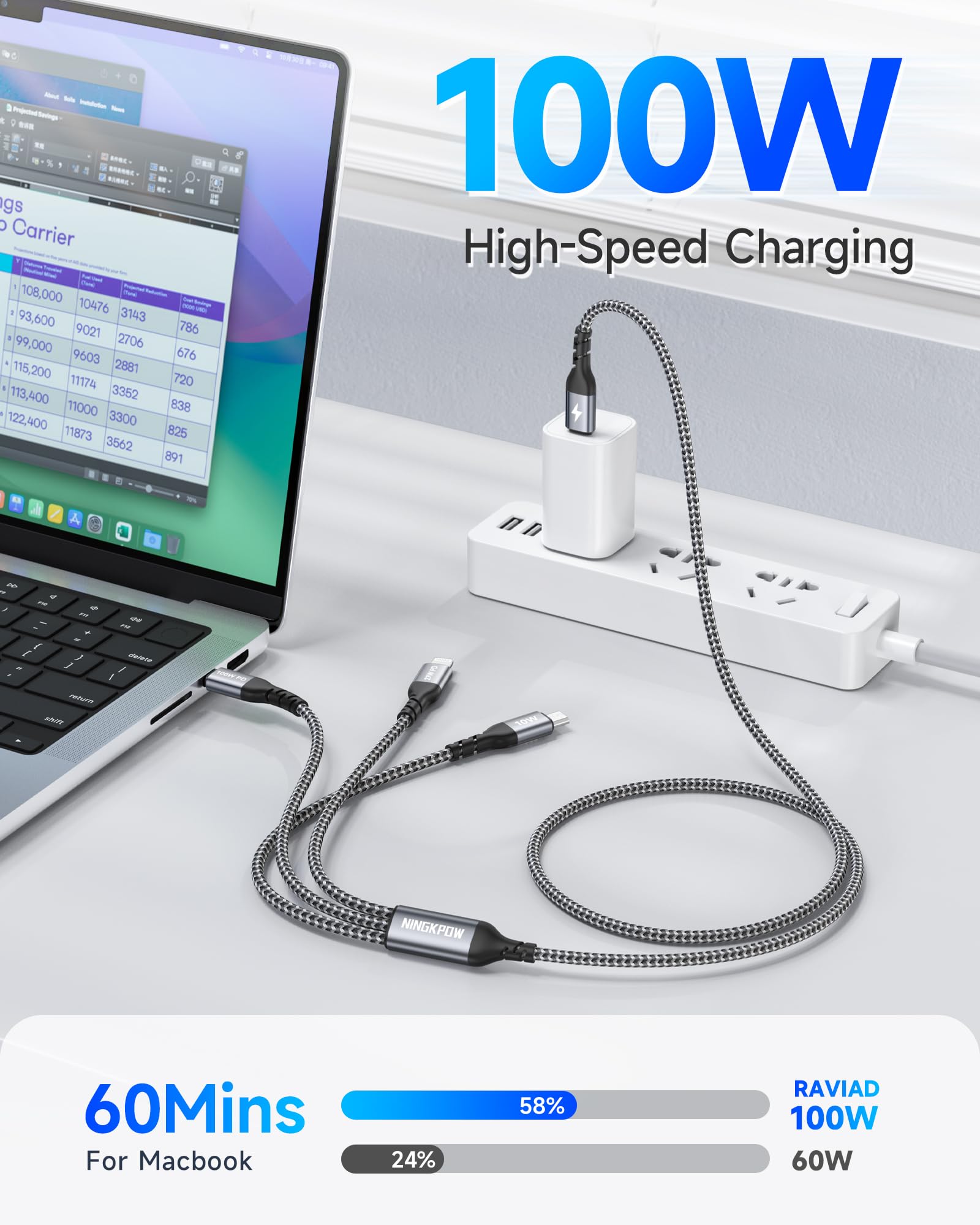 【多機能充電ケーブル】NINGKPOW 3in1 充電ケーブルには3つの異なる充電機能があり、あらゆる場面に適しています。寝室やオフィス、車の後部座席などでも自由にお使いいただけます。充電ニーズを満たすのに必要なケーブルは 1 本だけなので、作業が楽になります。 [注: 3 つのポートが同時に充電されている場合、合計電力は 100W です】