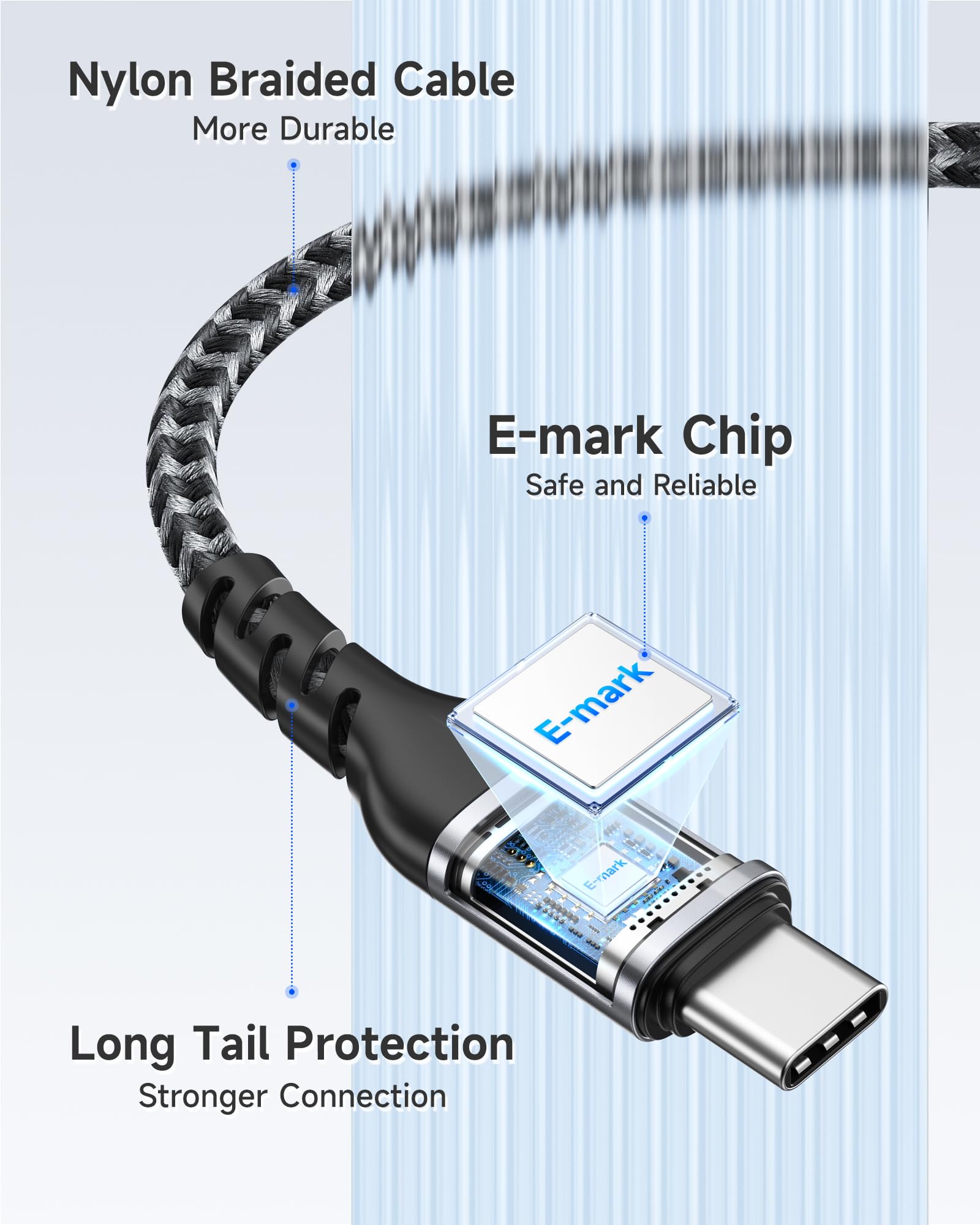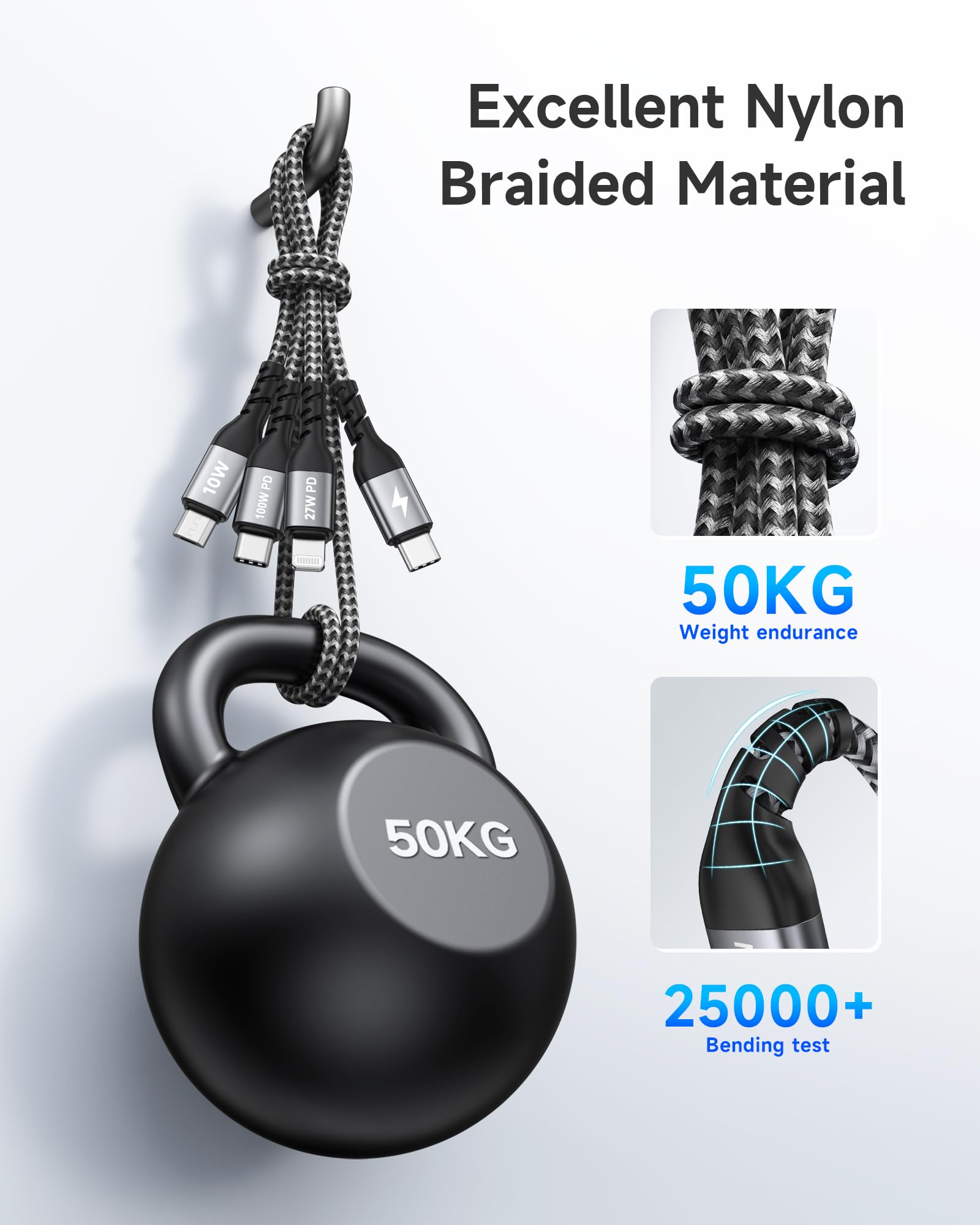 【超耐久性】ナイロン編組充電コード 3in1はアップグレードされた3Dアルミニウムコネクタと独自のレーザー溶接技術を採用しており、金属部品が壊れません。厳格な耐久性テストにより25,000回以上の曲げに耐え、ねじれや摩耗に対する優れた耐性を備えています。