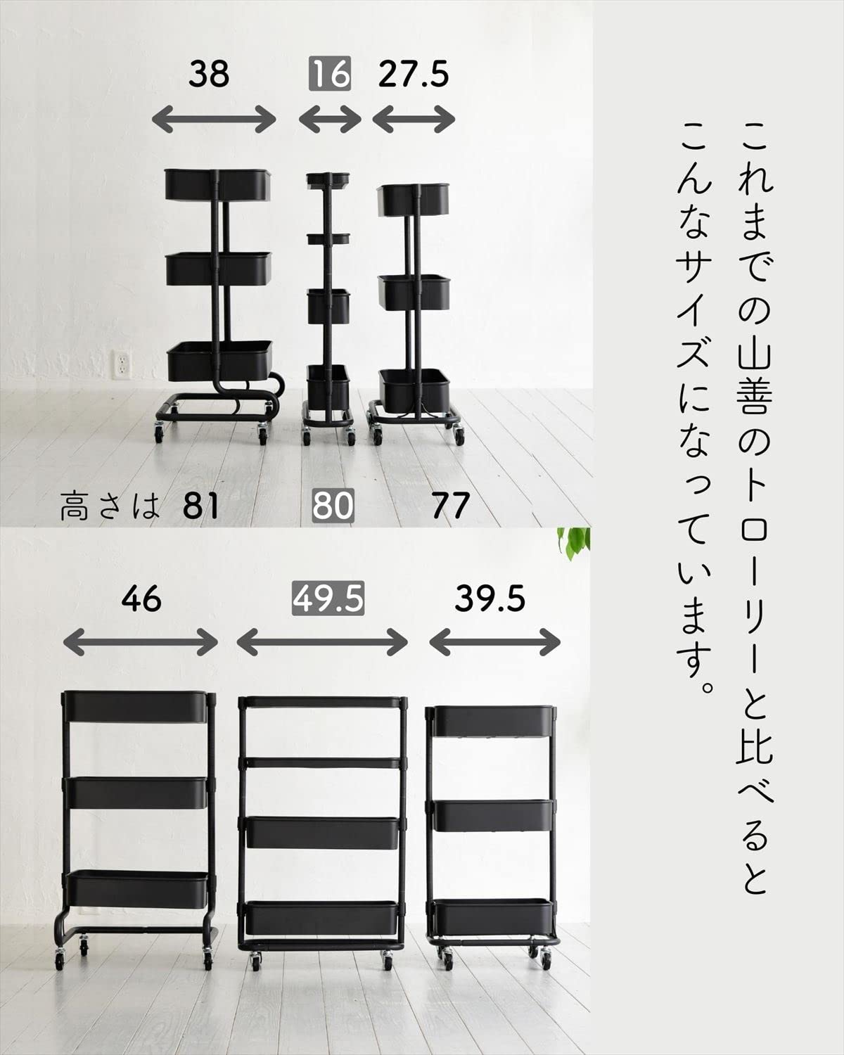 【特価セール】山善(YAMAZEN) 隙間トローリー すき間トローリー ワゴン キャスター付き 高さ調節可能 全体耐荷重40kg 幅16×奥行49.5×高さ80cm キッチンワゴン 隙間収納 ラック 組立品 ブラック LSST-4(BK) | nico3588