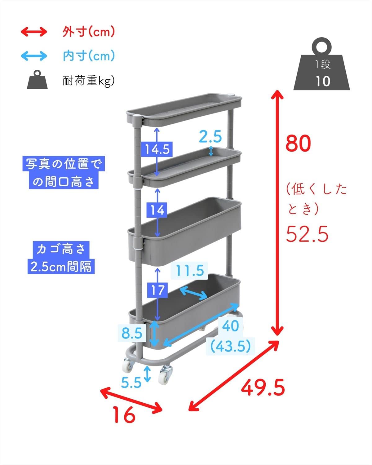 ●全体耐荷重:40kg(1段あたり10kg)