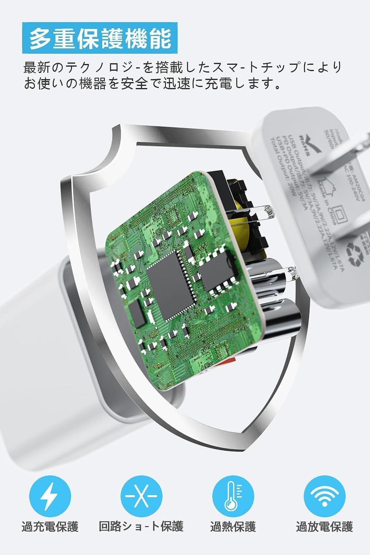 【PSE認証済で・安全】当社のiPhone充電器はPSE認証を取得し、厳格な品質管理を通じて、更に過熱、過充電、過放電および回路ショート防止など給電保護機能搭載しており、iPhone/iPadデバイスに自動的に必要な電流に適合し、迅速かつ安定してデバイスを充電できます。