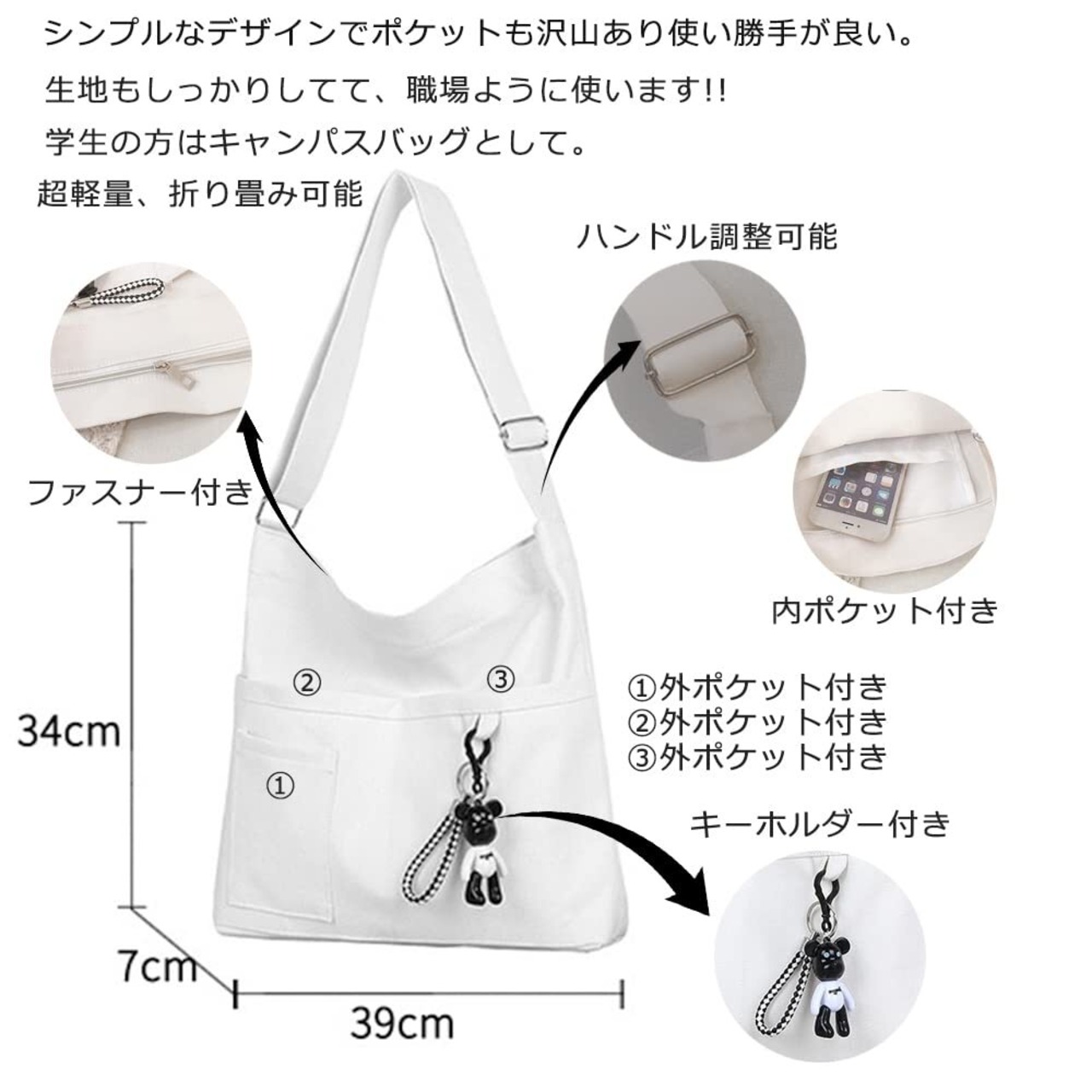 サイズ:約 39cm 高さ:34cm マチ幅:7cm 注意:キャンバスバッグのぬいぐるみペンダントは含まれています。