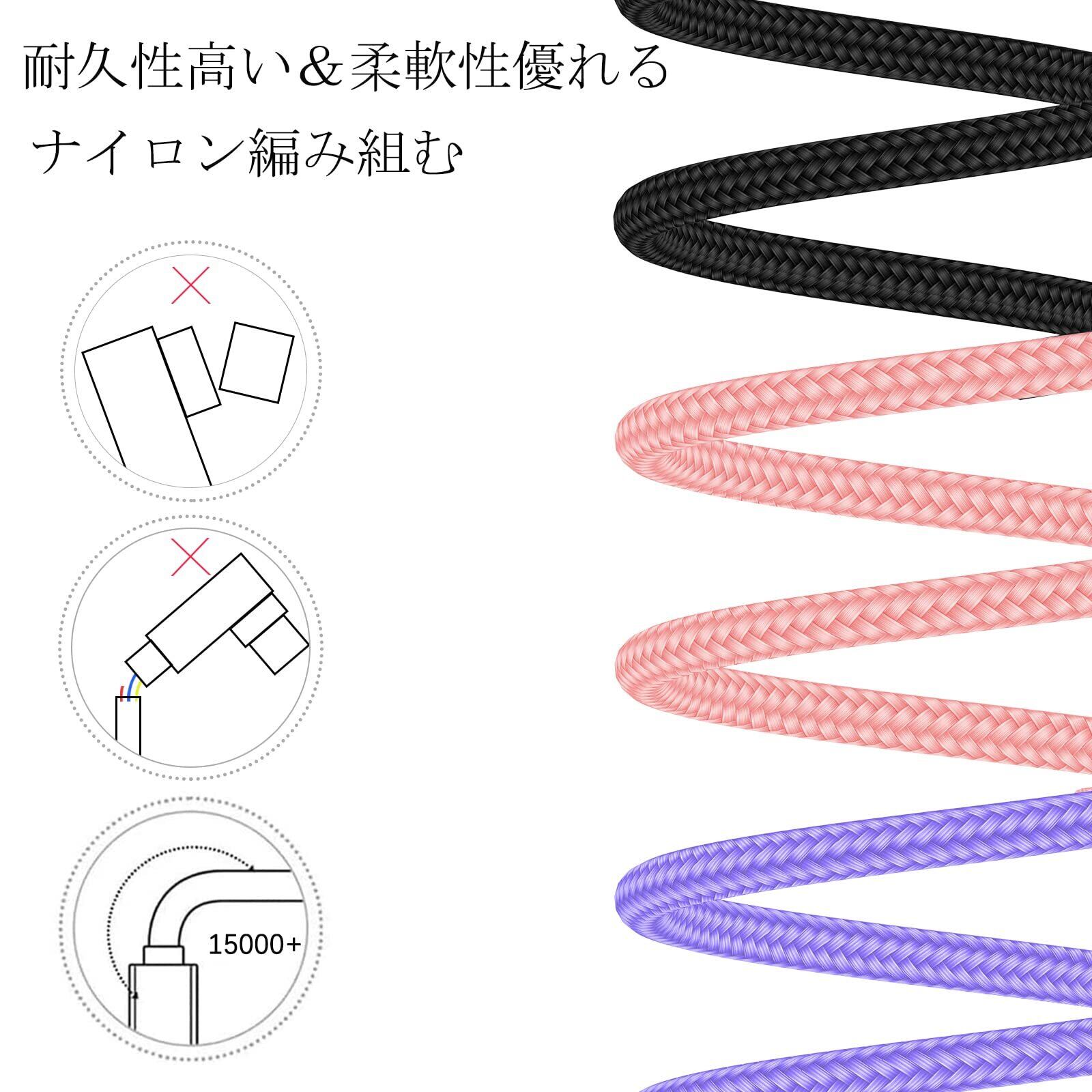 【さらなる耐久性】一般的なケーブルより、うちのLightningケーブルでは15倍以上の耐久性をもち、15,000回以上のきびしい折り曲げに耐える。太いコードのデザインで耐久性をさらに向上させました。iPhone 充電ケーブルのコネクターも丈夫で、安心して充電することができる。ナイロン編みにより、手触りがよく、耐久性もより高いです。