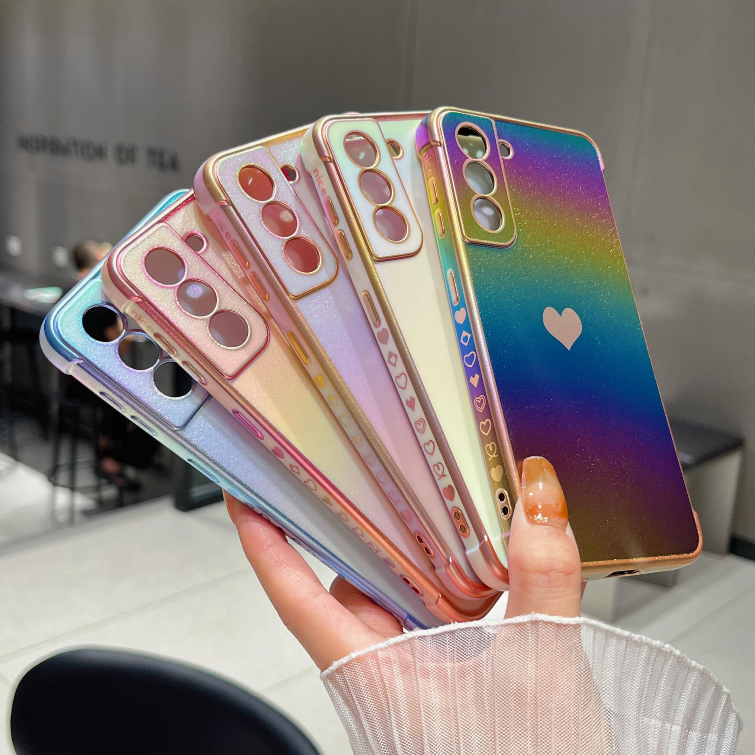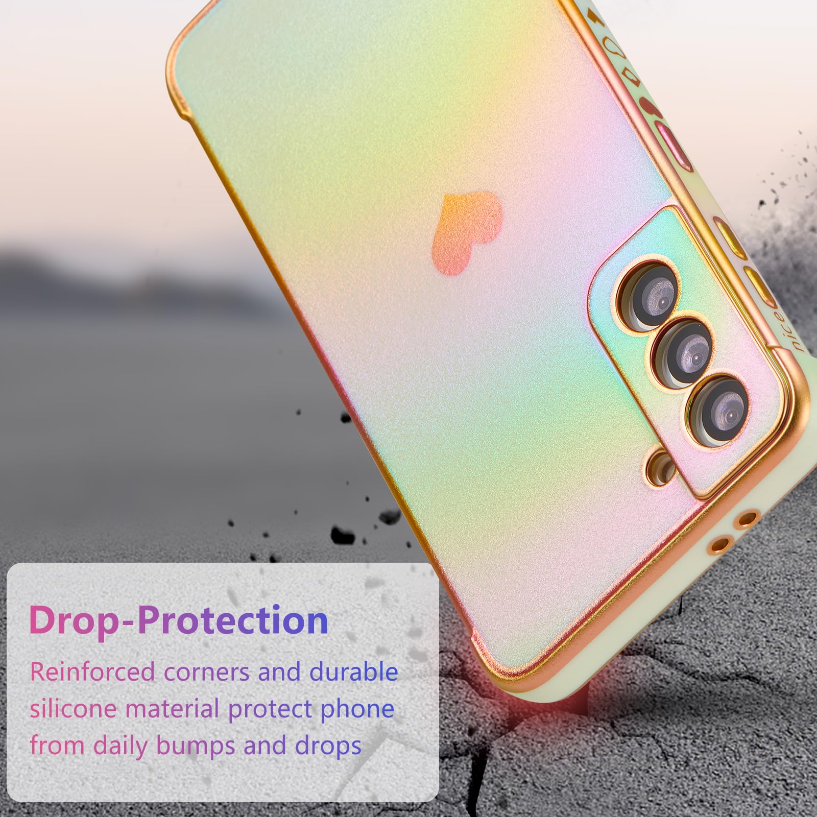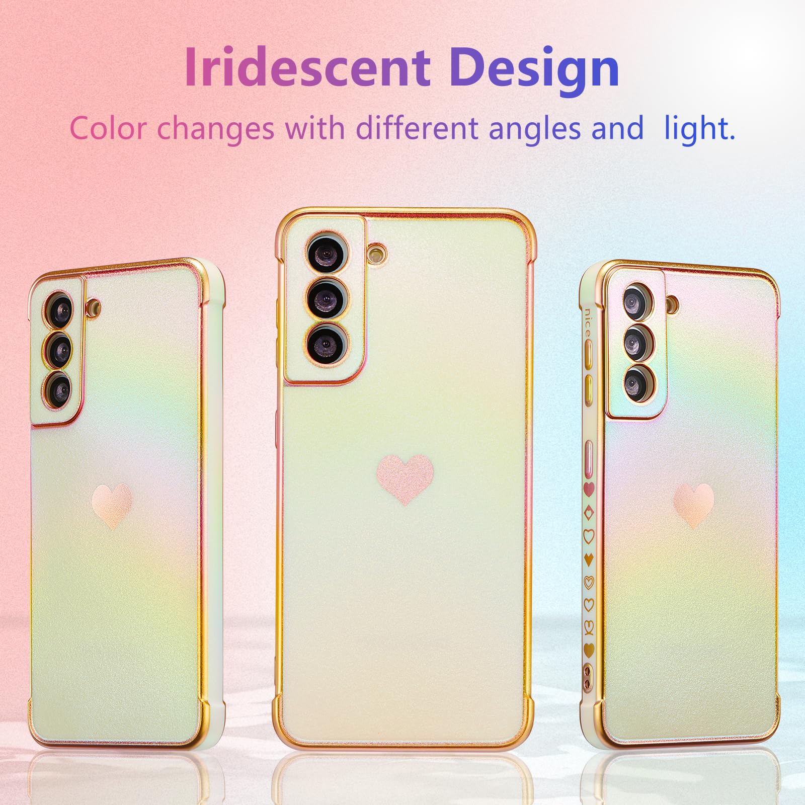 【虹色デザイン】電気メッキ技術により、縁と小さなラブハートパターンを装飾し、メッキされた縁は決して色褪せず、ケース全体が光沢があり、異なる動きや光によって色が変化します;すべてがこのS22ケースをよりスタイリッシュにし、目を引く;女の子と女性のための素敵な贈り物。