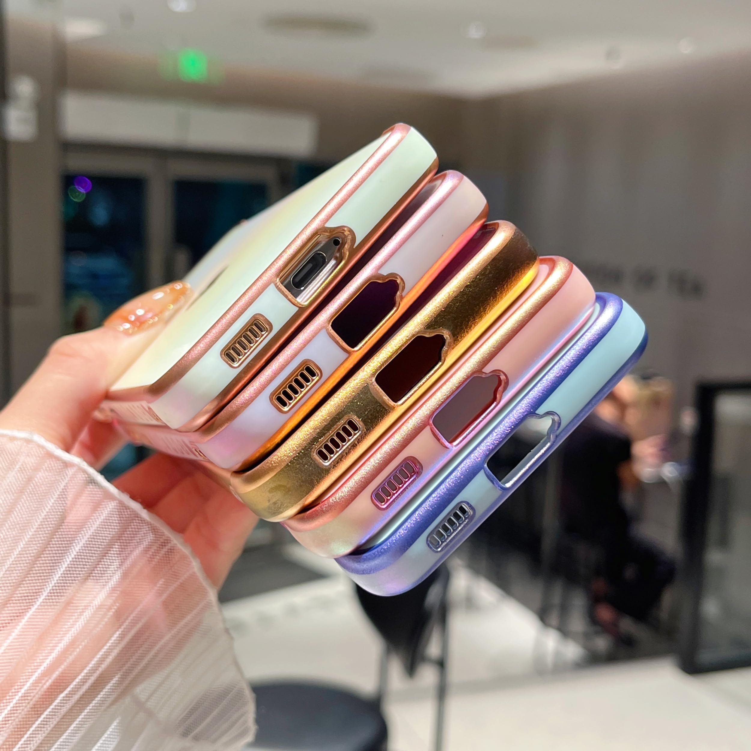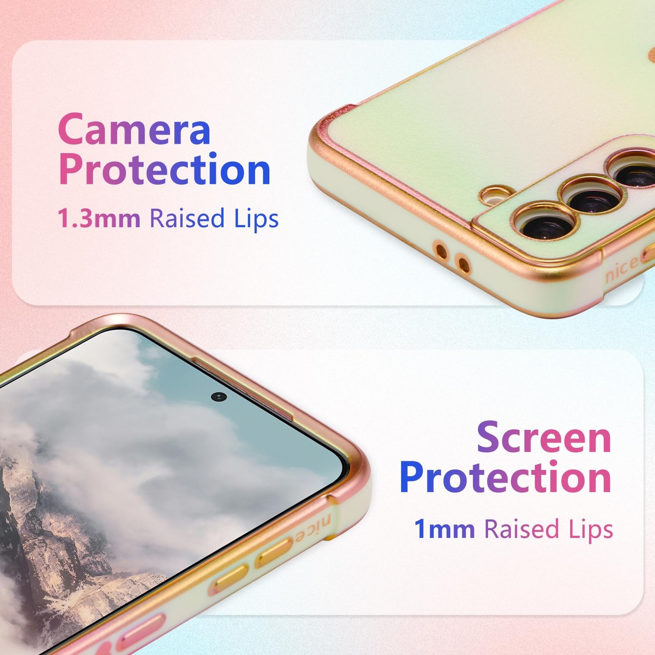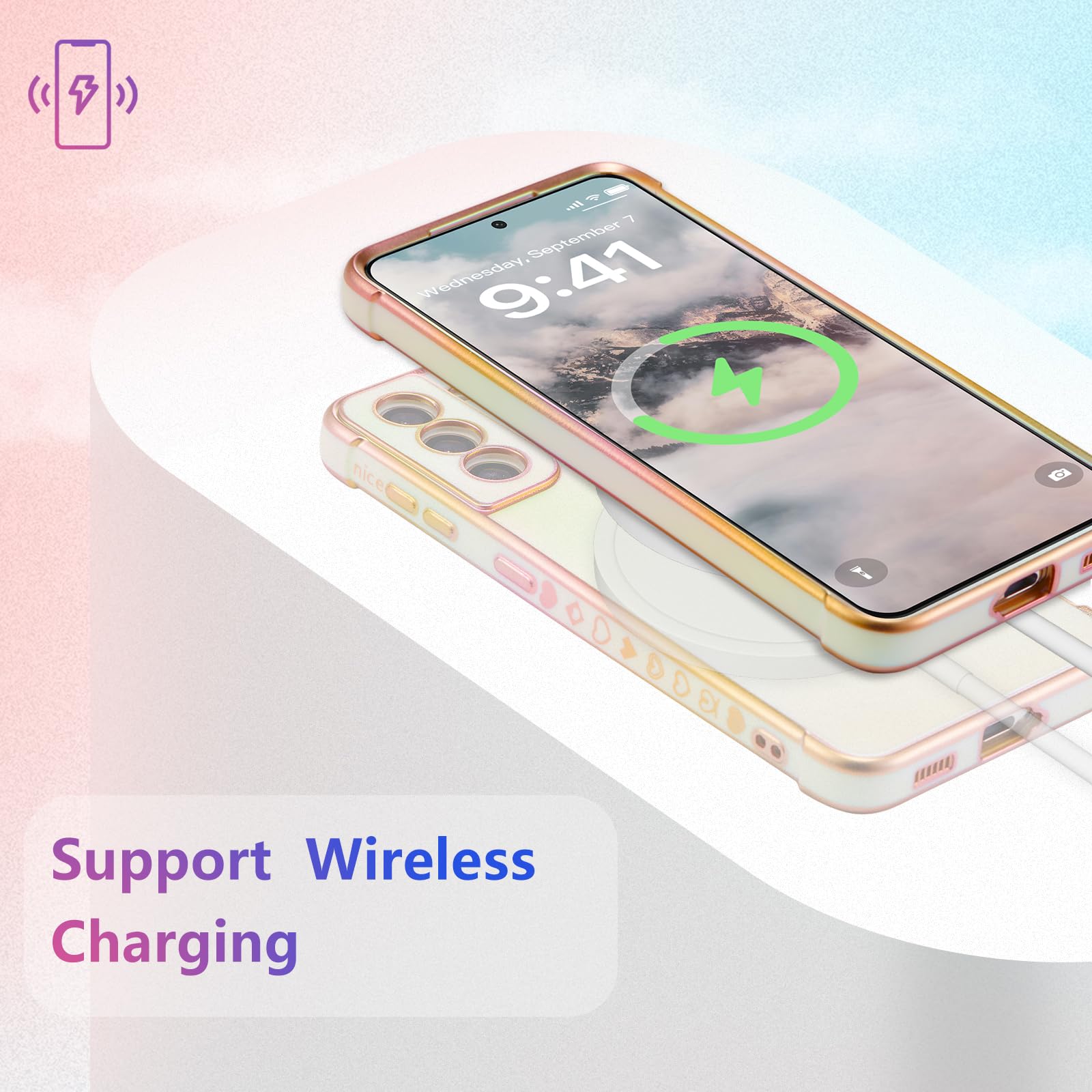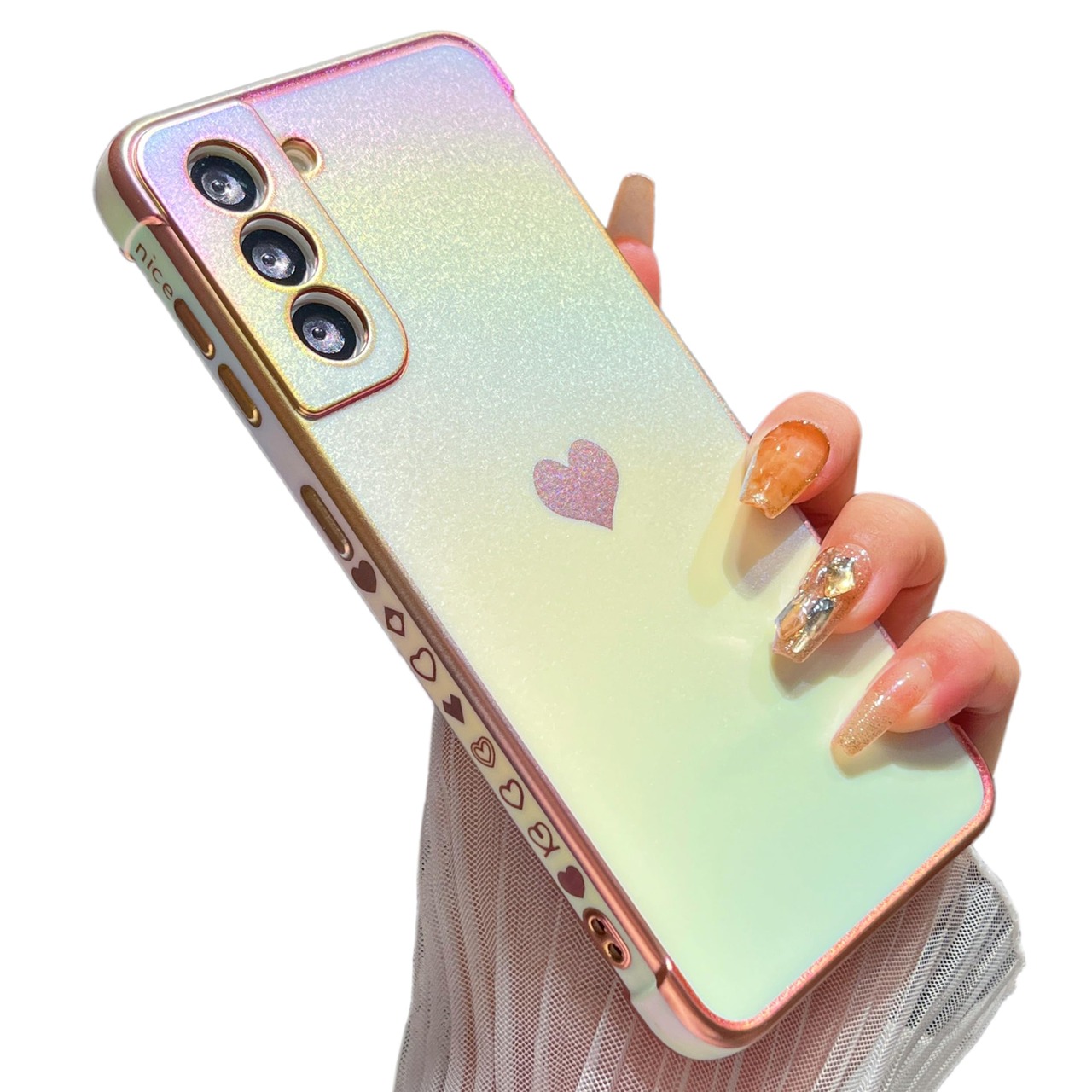 【虹色デザイン】電気メッキ技術により、縁と小さなラブハートパターンを装飾し、メッキされた縁は決して色褪せず、ケース全体が光沢があり、異なる動きや光によって色が変化します;すべてがこのS22ケースをよりスタイリッシュにし、目を引く;女の子と女性のための素敵な贈り物。