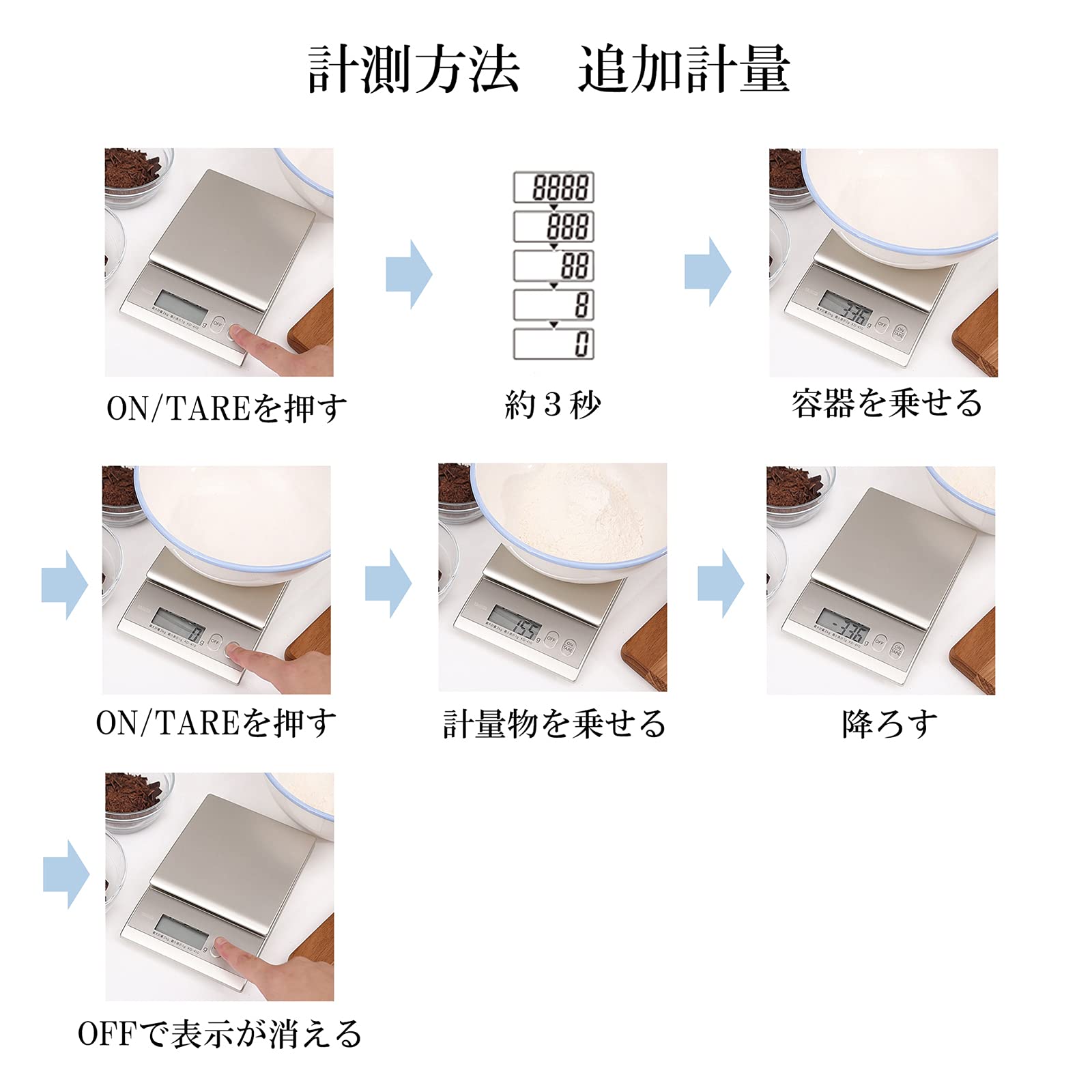 最大計量:2kg、最小表示:1g、文字高:15mm、機能:0表示(風袋引き)・地域設定機能付き